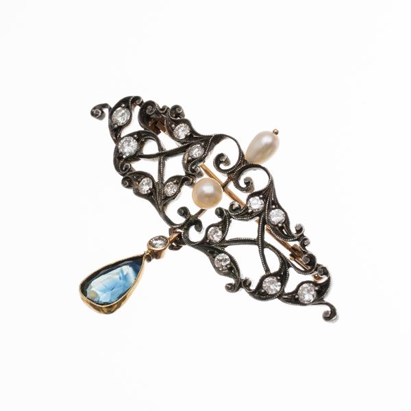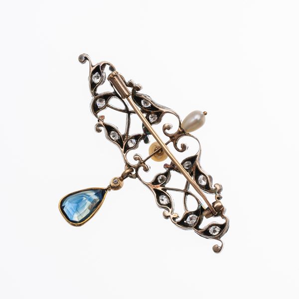 Oro giallo 18 kt e argento con goccia di zaffiro (10x6 mm) di circa 2 ct., due perle coltivate e tredici diamanti taglio brillante (0,50 ct totali).