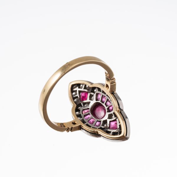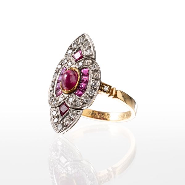 Oro 18 kt e platino con rubino rosso intenso cabochon di circa 0,40 ct Burma con nessun'evidenza di trattamento termico e contorno di 10 rubini taglio quadrato a gradini ct. 0,50, 30 diamanti taglio brillante huit - huit colore GH-VSSI ct. 0,50 con incisione Tiffany Paris
