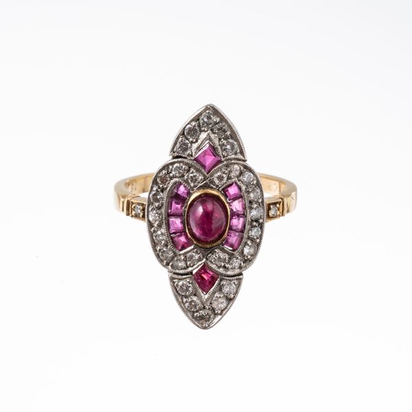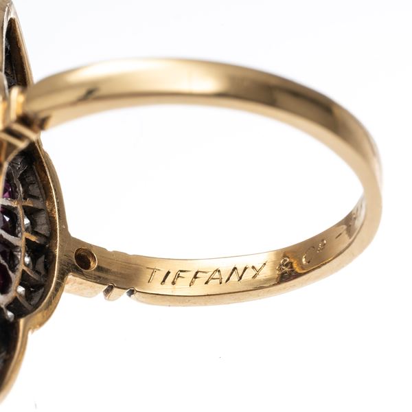 TIFFANY & CO - ANELLO IN ORO GIALLO 18 KT E PLATINO, RUBINI E DIAMANTI TAGLIO BRILLANTE CON INCISIONE 'TIFFANY PARIS'