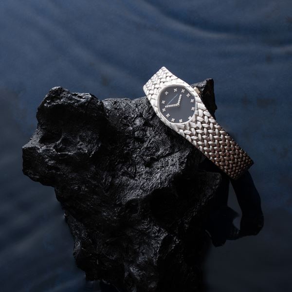 Note: Orologio solo tempo a carica manuale in oro bianco 18kt con bracciale integrato Gilbert Gaschen in oro bianco 18kt. Quadrante nero, indici e sfere diamante taglio brillante. Fondello a pressione in oro bianco 18kt. Vetro minerale piatto.