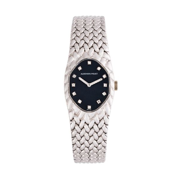 OROLOGIO SOLO TEMPO A CARICA MANUALE IN ORO BIANCO 18KT CON BRACCIALE INTEGRATO IN ORO BIANCO 18KT, QUADRANTE NERO CON INDICI E SFERE DIAMANTE TAGLIO BRILLANTE