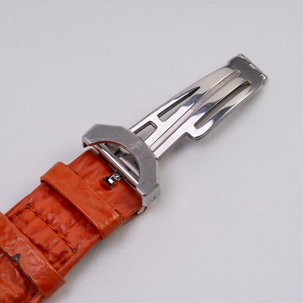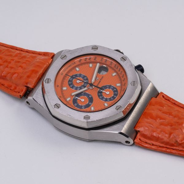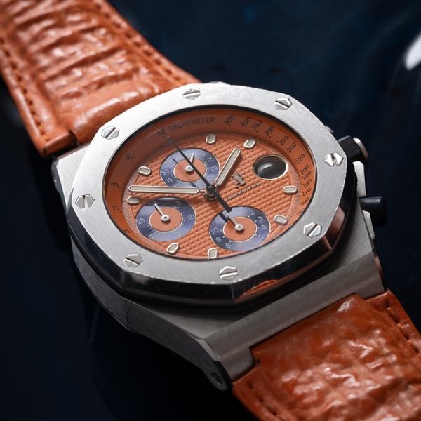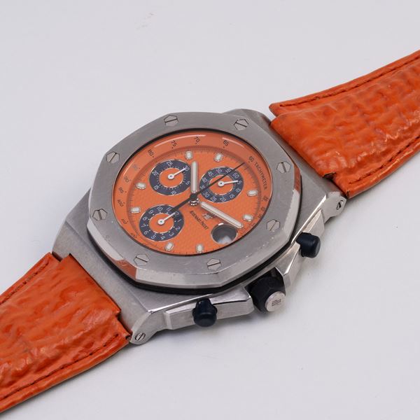 Note: Cronografo a carica automatica in acciaio con quadrante tapisserie arancione. Datario ad ore tre. Indici e sfere a bastone con materiale luminescente. Cinturino in pelle arancione Audemars Piguet, deployante in acciaio Audemars Piguet. Vetro minerale piatto. Fondello in acciaio.