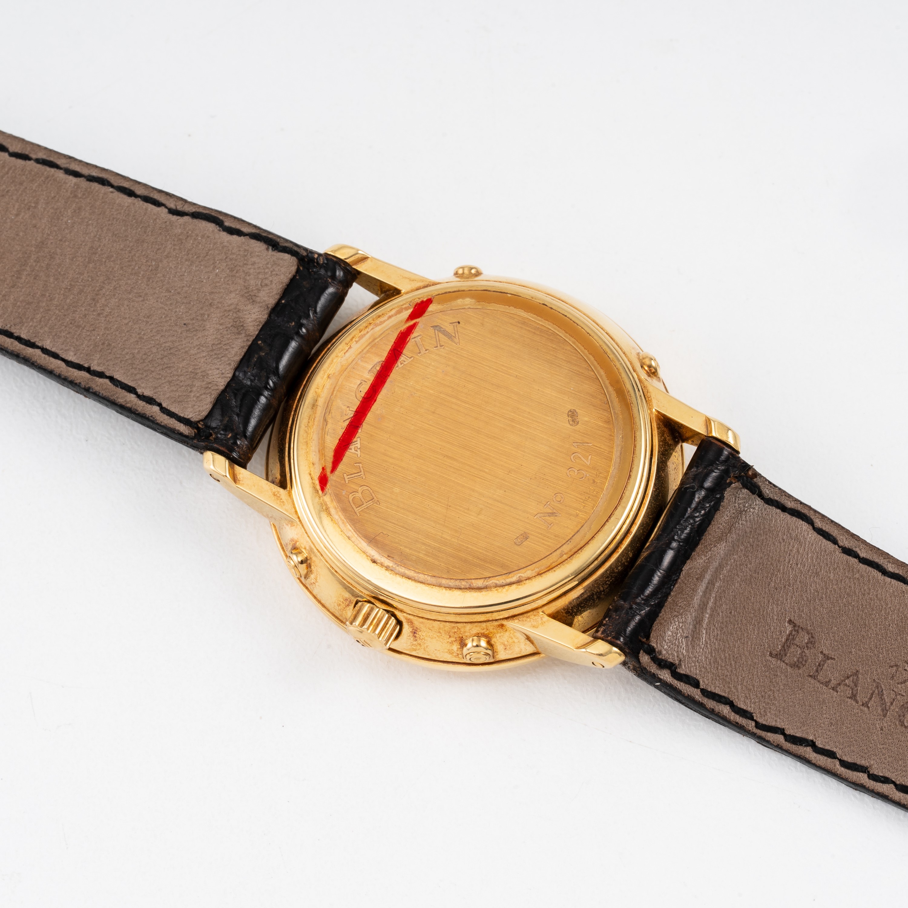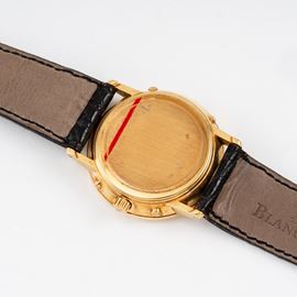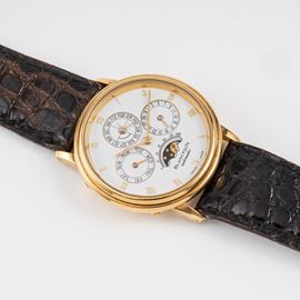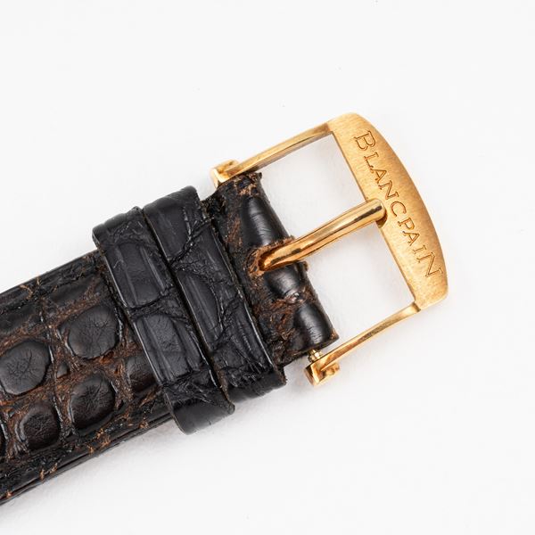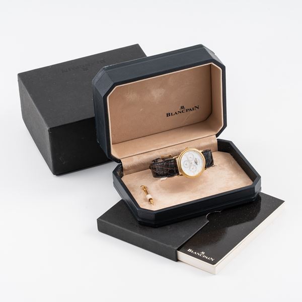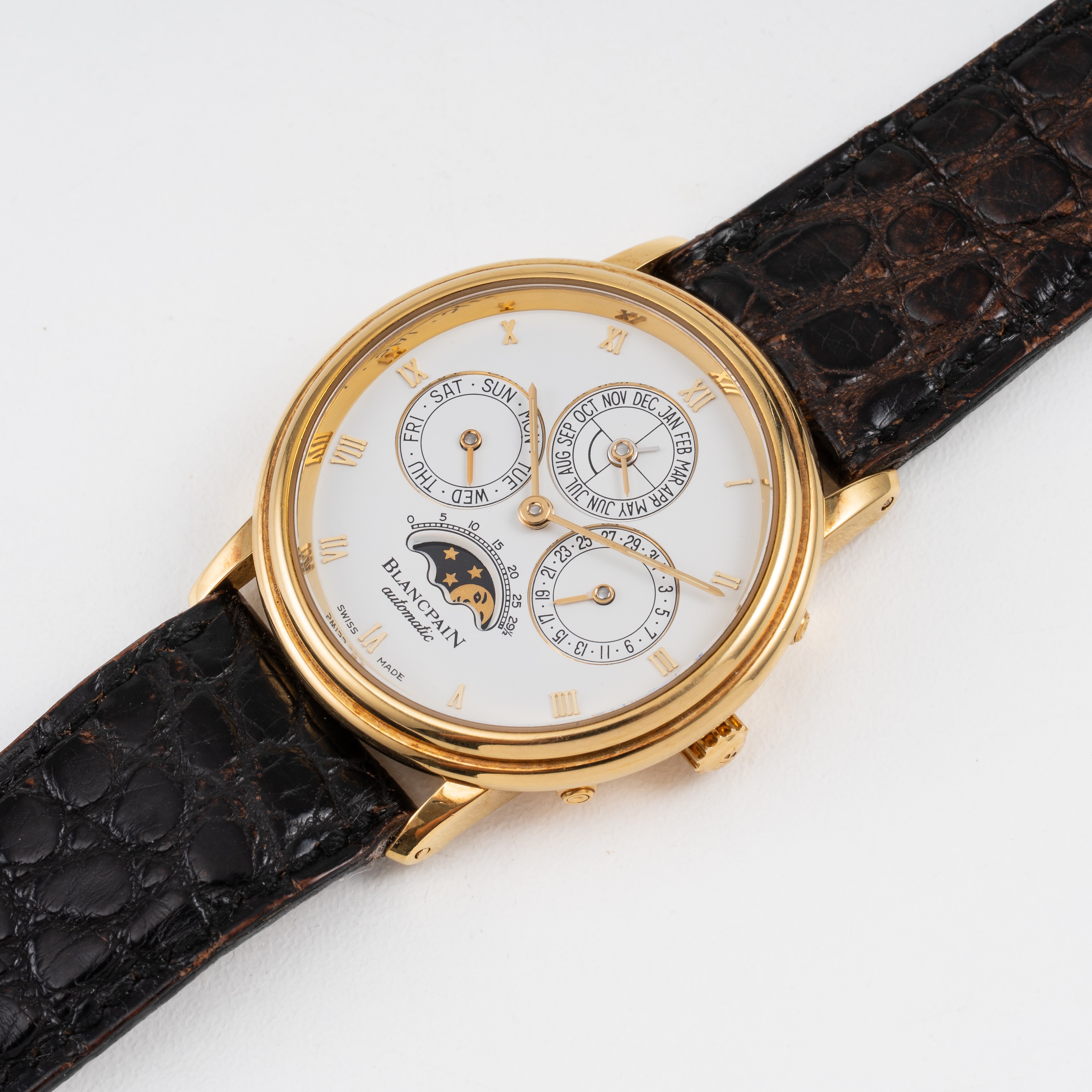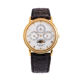 Note: Calendario perpetuo a carica automatica in oro giallo 18kt. Quadrante bianco, fasi luna ad ore sei. Contatore della data ad ore tre, del giorno ad ore nove, e del mese ad ore dodici. Indici romani e sfere a bastone dorati. Cinturino in pelle, fibbia in oro giallo 18kt Blancpain. Vetro minerale piatto. Fondello a pressione in oro giallo 18kt.