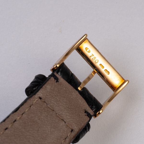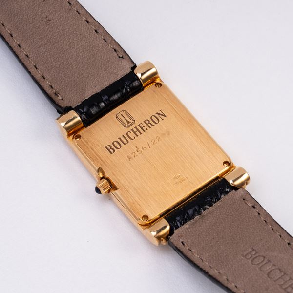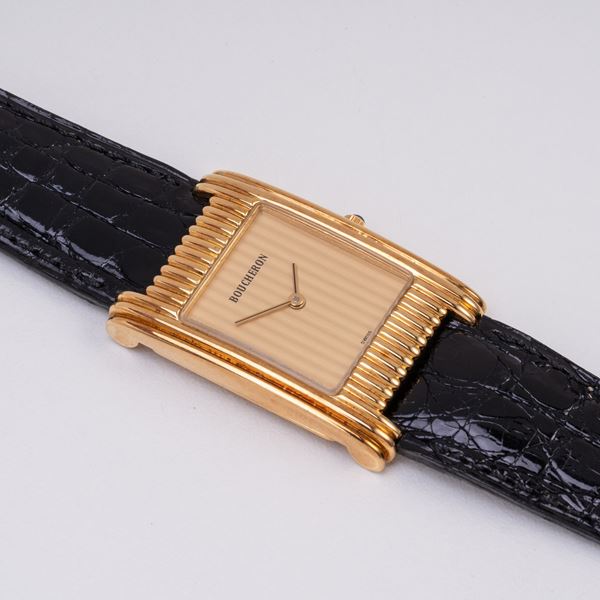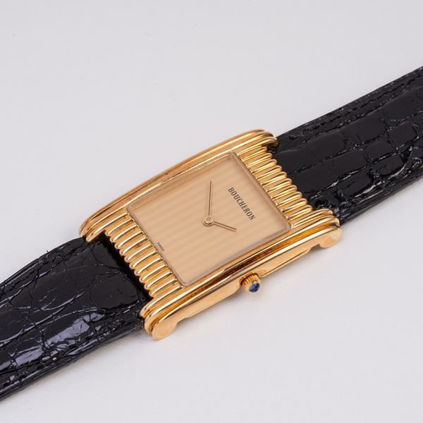 Note: Orologio solo tempo al quarzo in oro giallo 18kt con cassa lavorata. Quadrante champagne, sfere a bastone dorate. Corona con cabochon. Cinturino in pelle Boucheron, fibbia in oro giallo 18kt. Vetro minerale curvo. Fondello in oro giallo 18kt.