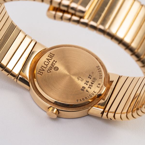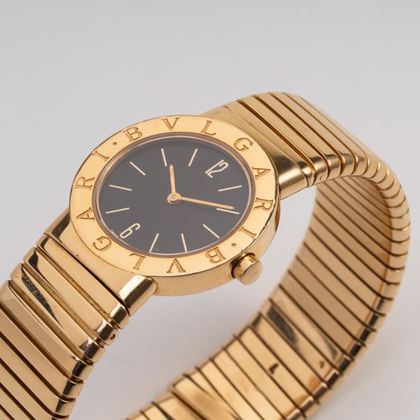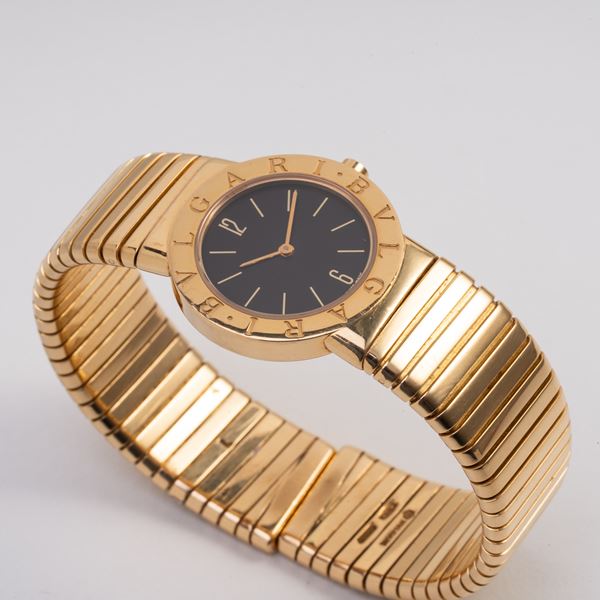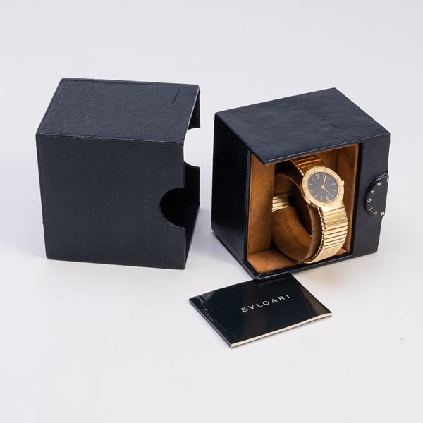 Note: Orologio solo tempo al quarzo. Quadrante nero, indici e sfere a bastone dorati, indici arabi ad ore sei ed a ore dodici. Bracciale elastico in oro giallo 18 kt. Vetro minerale piatto. Fondello a pressione in oro giallo 18 kt.