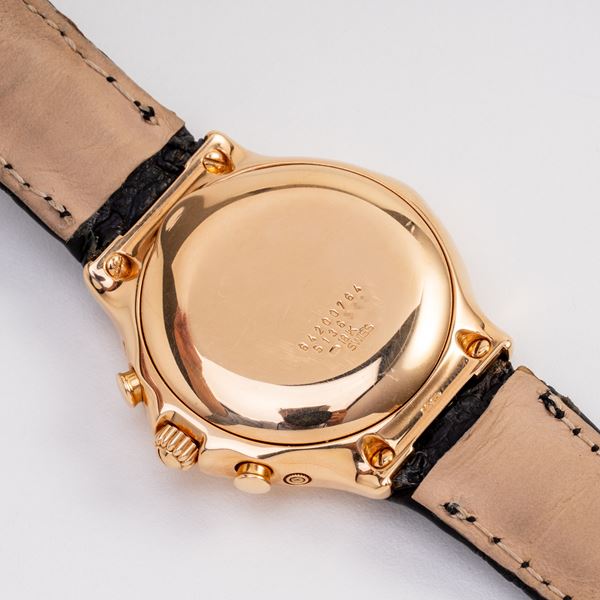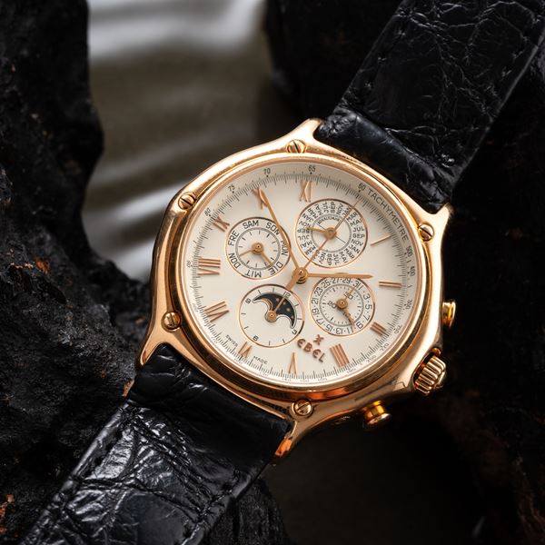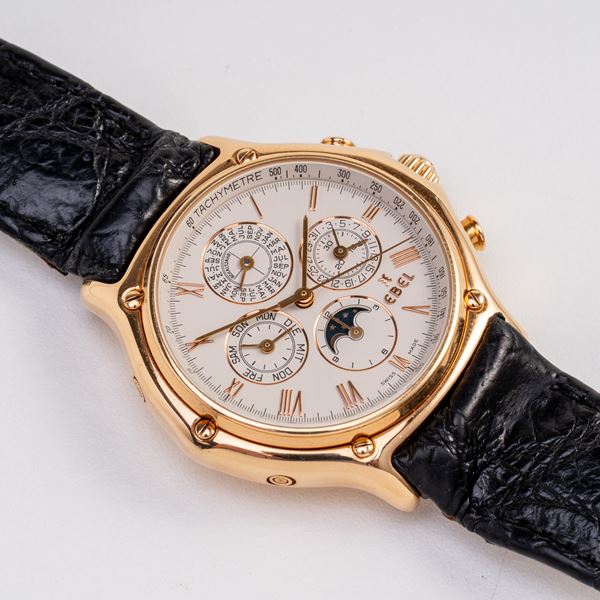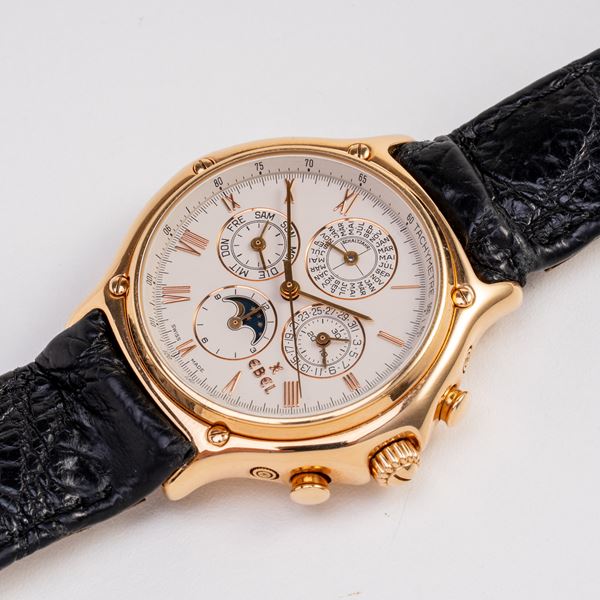 Note: Cronografo calendario perpetuo in oro rosa 18kt a carica automatica con fasi luna ad ore sei. Quadrante bianco, indici e sfere a bastone in oro rosa. Contatore dei minuti cronografici e del datario ad ore tre, delle ore e fasi luna ad ore sei, dei secondi e del giorno ad ore nove e il contatore del mese ad ore dodici. Il contatore ad ore dodici riporta la dicitura 'Schaltjahr', che significa bisestile in tedesco. Scala tachimetrica interna. Cinturino in pelle, deployante in oro rosa 18kt Ebel. Vetro minerale piatto. Fondello a pressione in oro rosa 18kt.