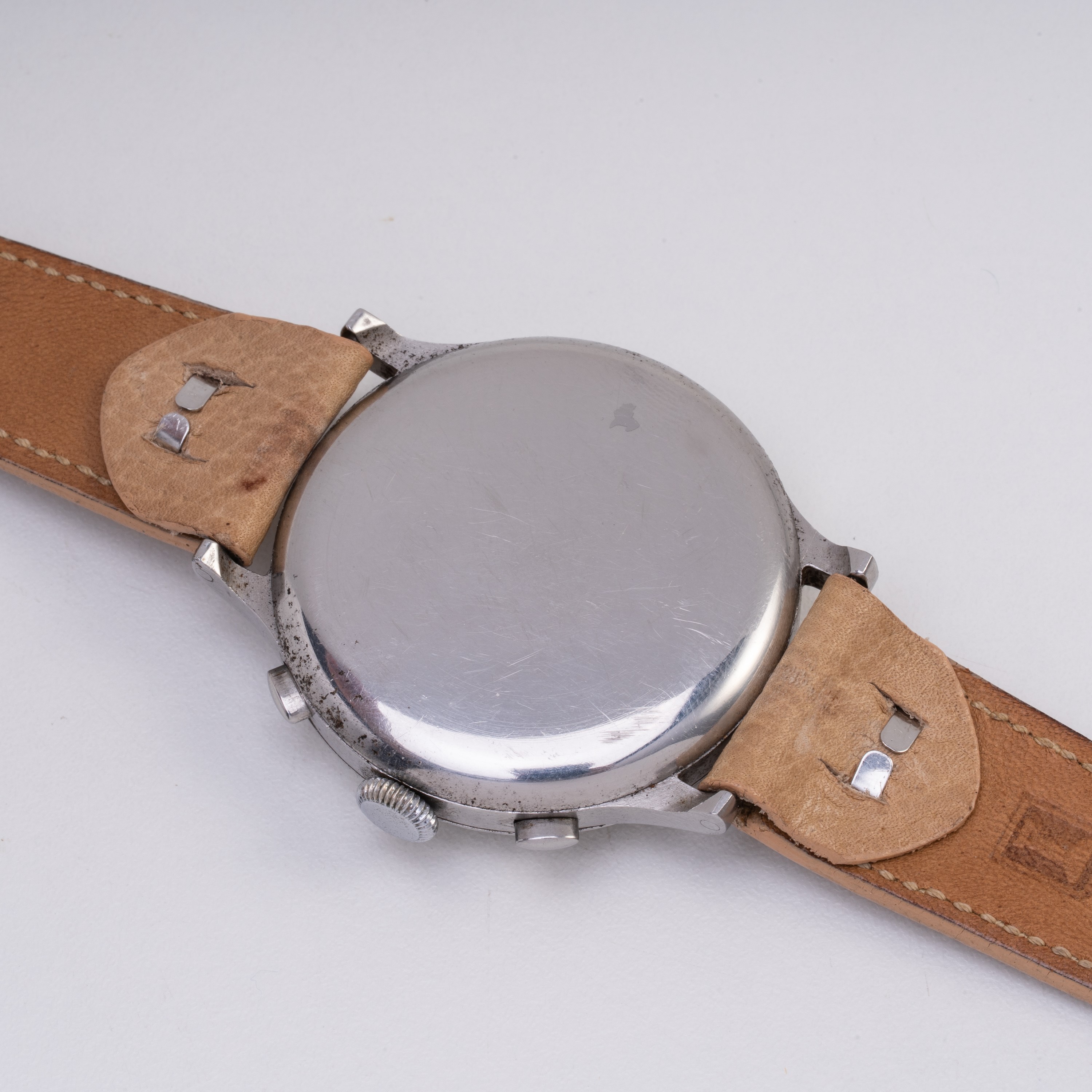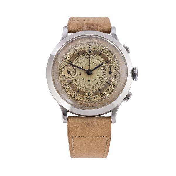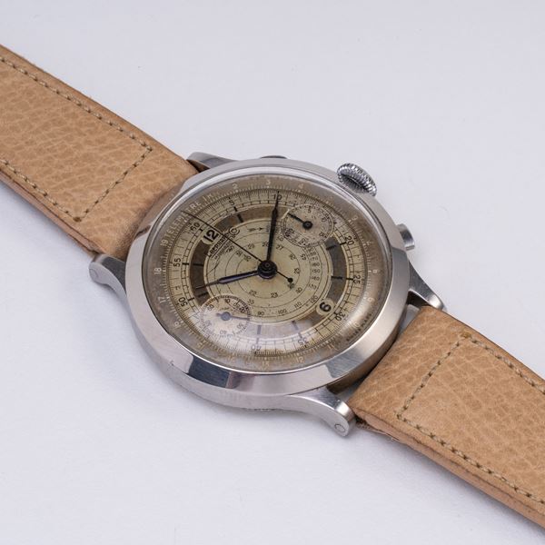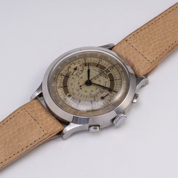 Note: Cronografo in acciaio a carica manuale. Quadrante bitonale specchiato, scala telemetrica. Indici a bastone e arabi neri ad ore dodici e sei. Sfere brunite blu. Pulsante di stop cronografico a slitta. Vetro plexiglass bombato. Fondello a pressione in acciaio.