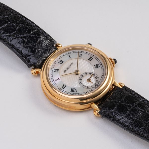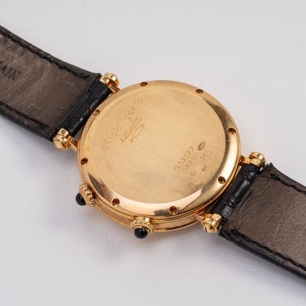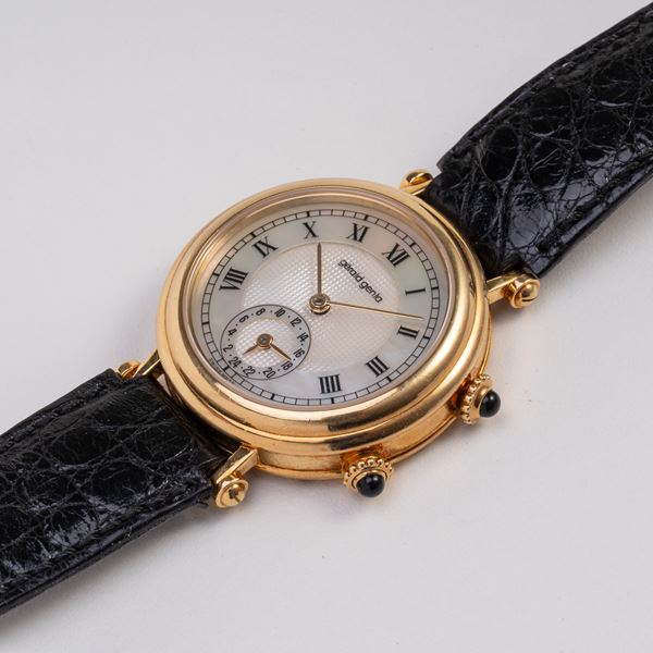 Note: Orologio solo tempo a carica automatica in oro giallo 18kt. Quadrante bianco 'clous de Paris' e madreperla. Indici romani neri, sfere a bastone in oro giallo 18kt. Corona di carica con cabochon blu ad ore due, corona del doppio fuso con cabochon blu ad ore quattro. Cinturino in pelle e fibbia in oro giallo 18kt Gerald Genta. Vetro minerale piatto. Fondello in oro giallo 18kt.