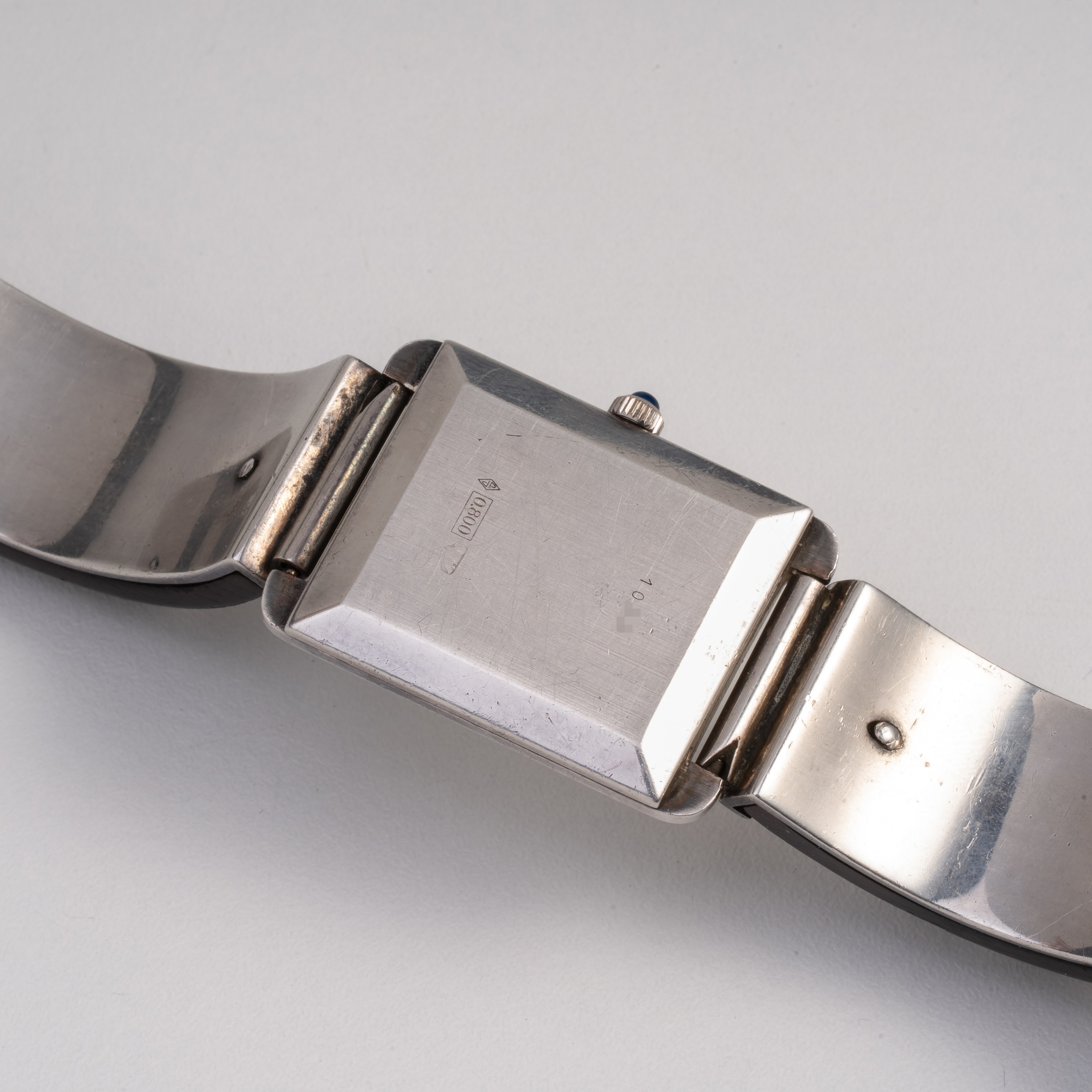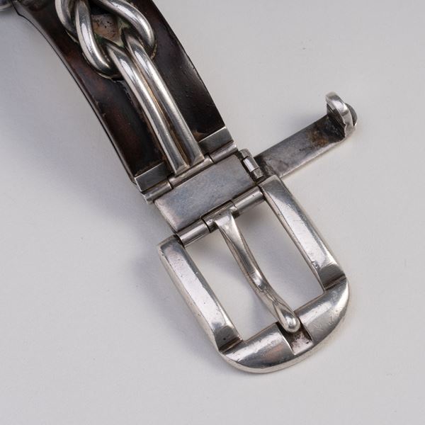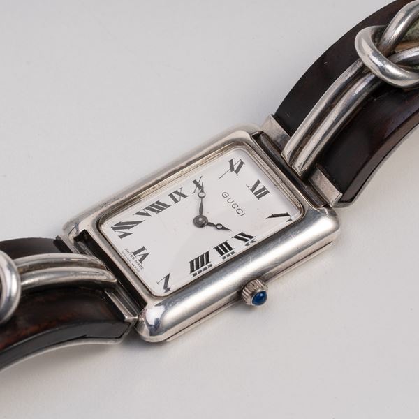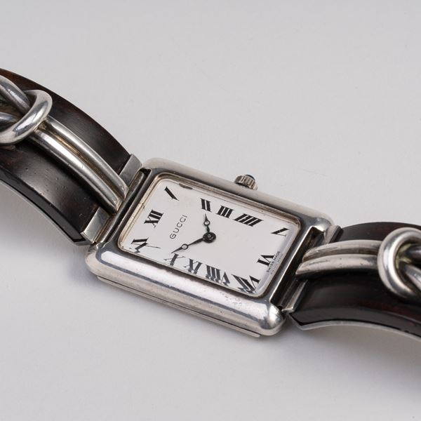 Note: Orologio solo tempo a carica manuale in argento. Bracciale in argento e legno con chiusura a fibbia. Quadrante bianco, indici romani neri, sfere breguet nere. Vetro plexiglass bombato. Fondello in argento a pressione.