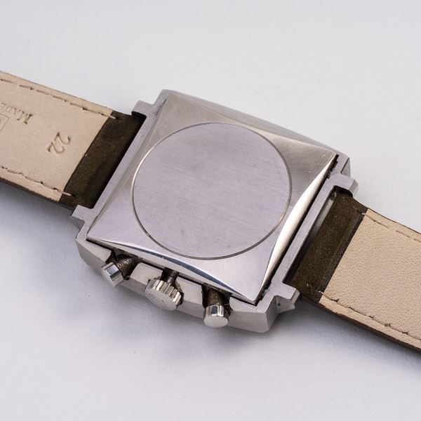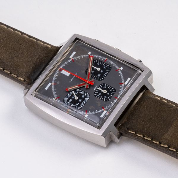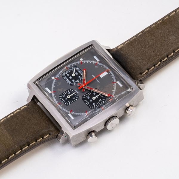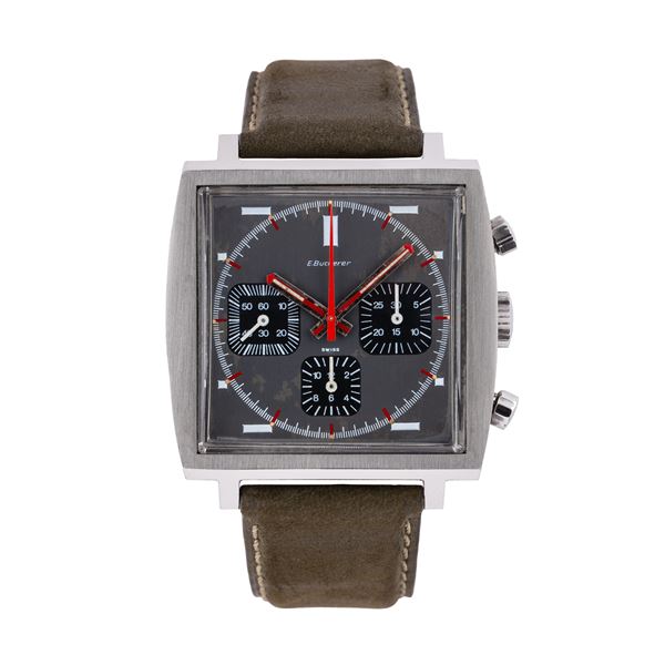 Note: Cronografo a carica manuale in acciaio. Quadrante grigio con personalizzazione per rivenditore 'Bucherer' ad ore dodici. Contatori cronografici neri, sfere e indici a bastone. Vetro plexiglass bombato. Fondello in acciaio a pressione.