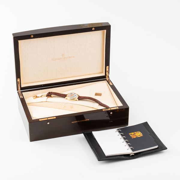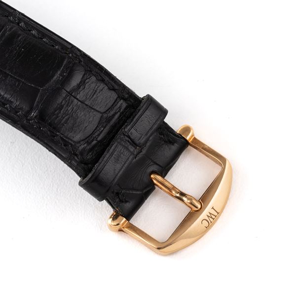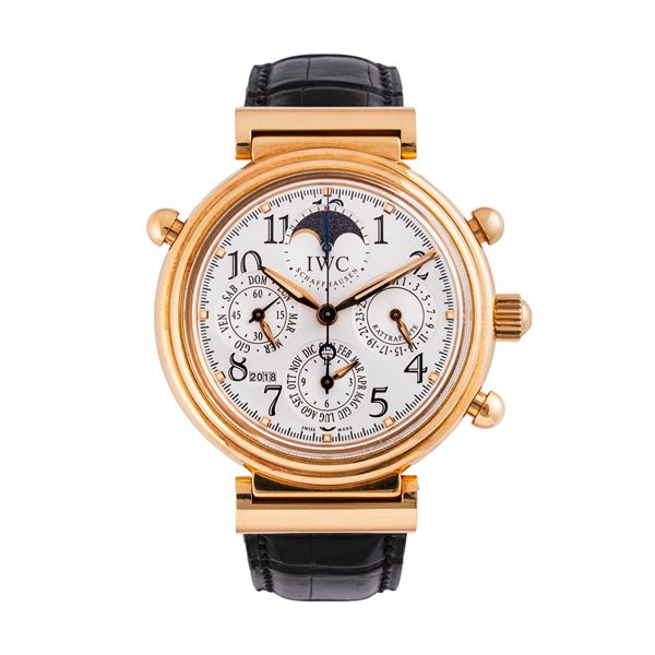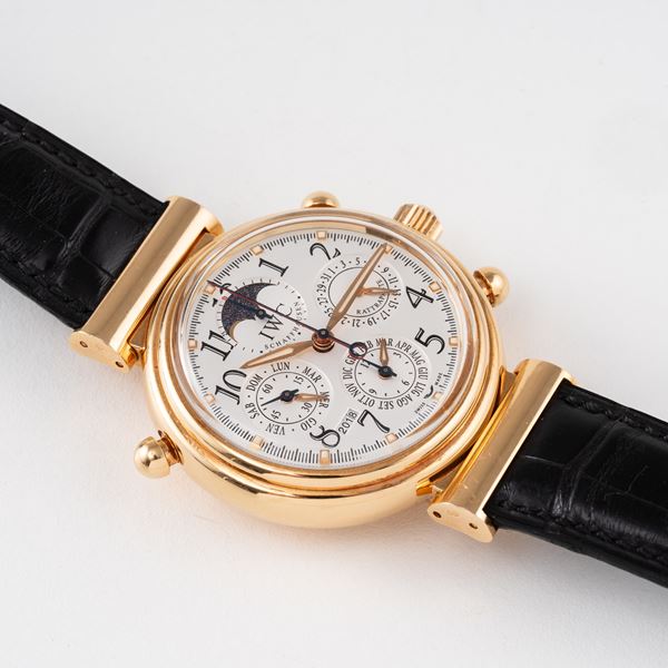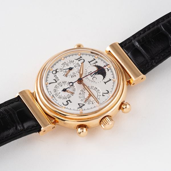 Note: Cronografo rattrappante calendario perpetuo in oro rosa 18kt a carica automatica. Quadrante argenté, sfere a foglia dorate con materiale luminescente, indici arabi neri. Fasi luna ad ore dodici, datario ad ore tre, Contatori dei minuti e del mese ad ore sei, piccoli secondi e contatore del giorno ad ore nove. Finestra dell'anno ad ore sette. Anse basculanti. Cinturino in pelle e fibbia in oro rosa 18kt IWC. Vetro plexiglass bombato. Fondello in oro rosa 18kt.