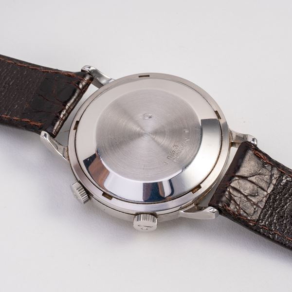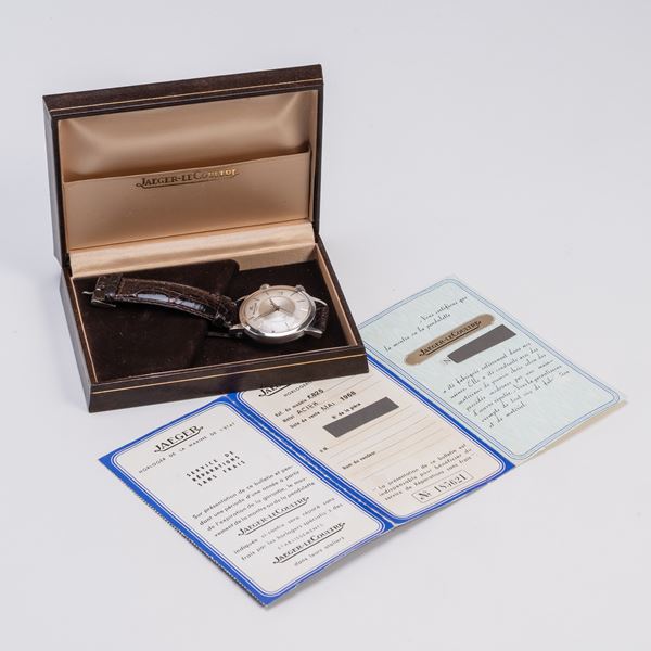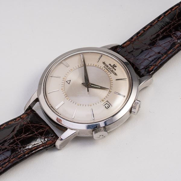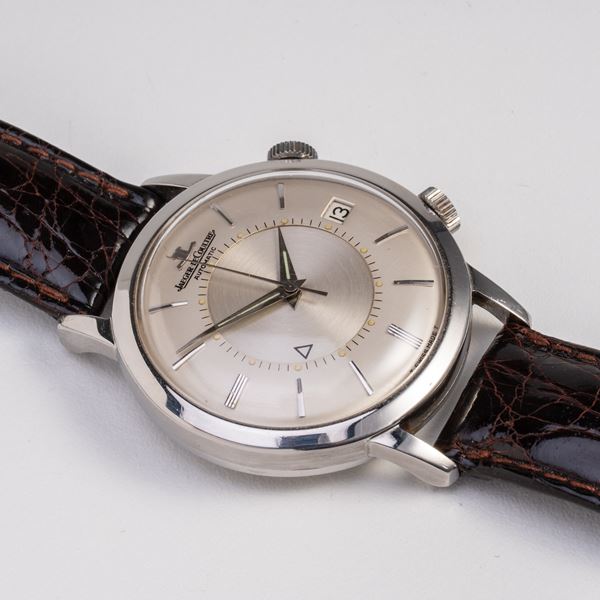 Note: Orologio svegliarino da polso a carica manuale in acciaio. Quadrante argenté bitonale, datario ad ore tre. Sfere dauphine con materiale luminescente, indici a bastone. Corona di carica ad ore quattro, corona di regolazione allarme ad ore due. Cinturino in pelle, fibbia in acciaio Jaeger LeCoultre. Vetro plexi bombato. Fondello in acciaio a vite.