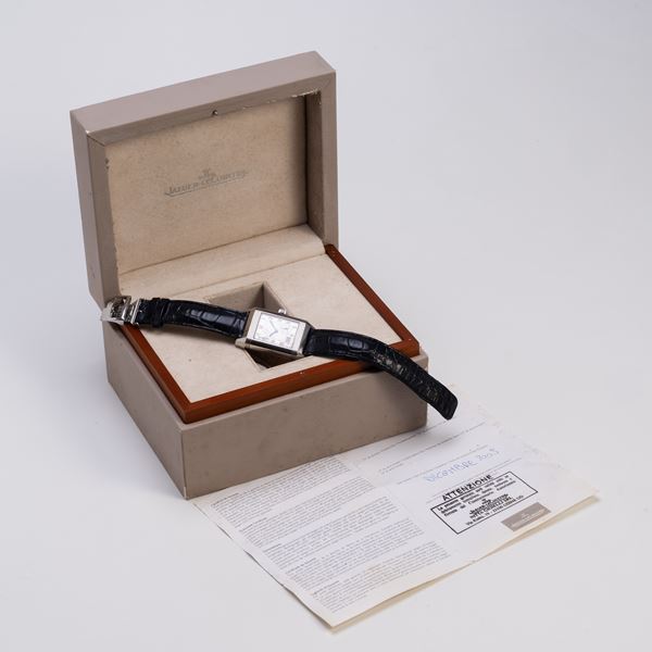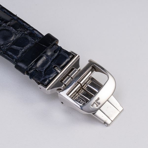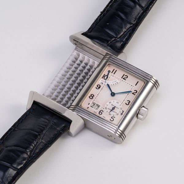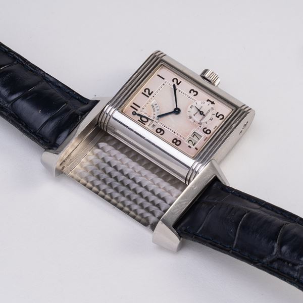 Note: Orologio a carica manuale in acciaio con riserva di carica. Quadrante bitonale virato al viola, indici arabi neri, sfere a bastone brunite blu. Indicatore di riserva di carica ad ore undici, datario ad ore sette e piccoli secondi ad ore quattro. Cinturino in pelle, deployante in acciaio Jaeger LeCoultre. Vetro minerale curvo. Fondello a vista.