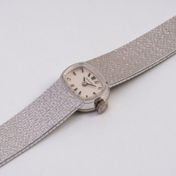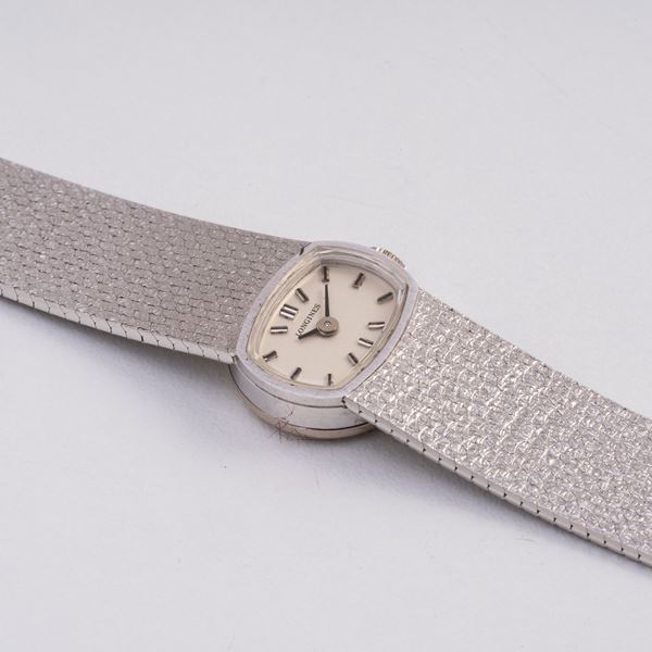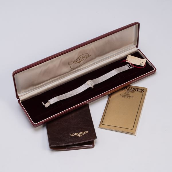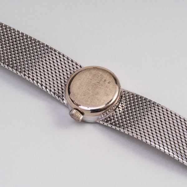Note: Orologio solo tempo a carica manuale in oro bianco 18kt e bracciale integrato in oro bianco 18kt. Quadrante argenté. Indici e sfere a bastone argentati. Vetro minerale piatto. Fondello in oro bianco 18kt.