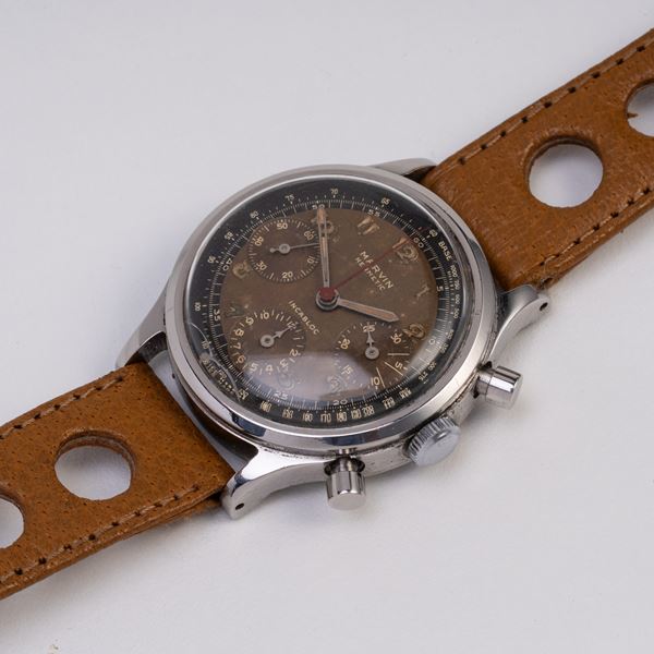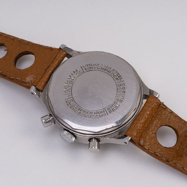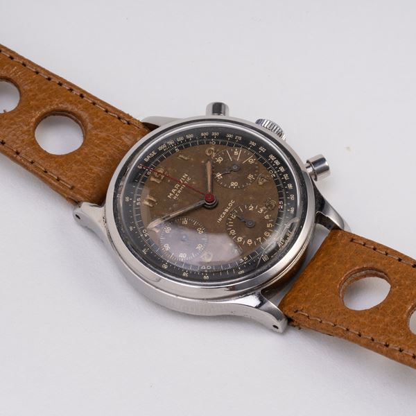 Note: Cronografo a carica manuale in acciaio. Quadrante tropicale, indici arabi con materiale luminescente. Sfere a bastone con materiale luminescente. Sfera cronografica rossa. Cinturino in pelle. Vetro plexiglass bombato. Fondello a vite in acciaio.