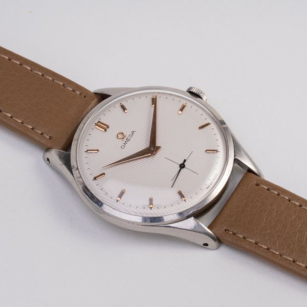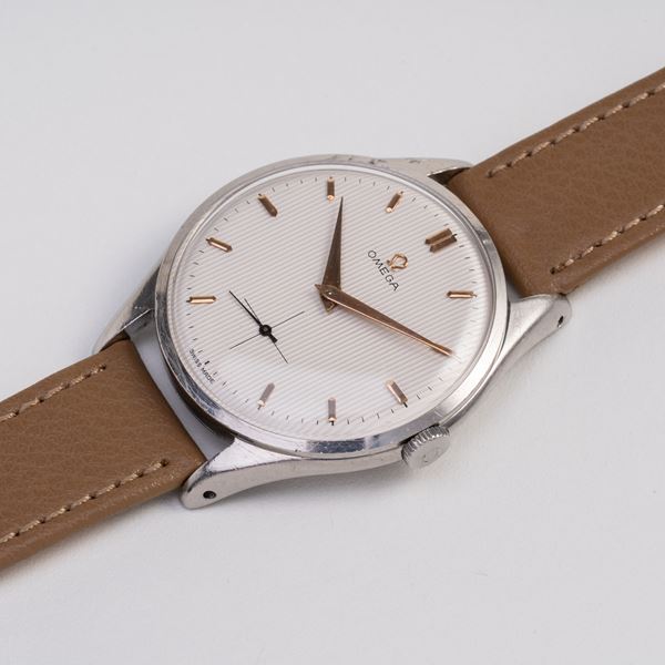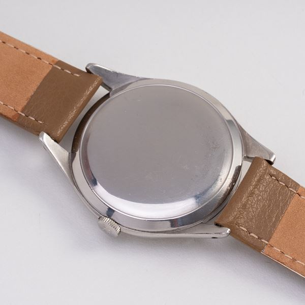 Note: Orologio solo tempo a carica manuale in acciaio con quadrante bianco 'tapestry'. Indici e sfere dauphine dorati. Cinturino in pelle. Vetro plexiglass bombato. Fondello in acciaio a pressione.