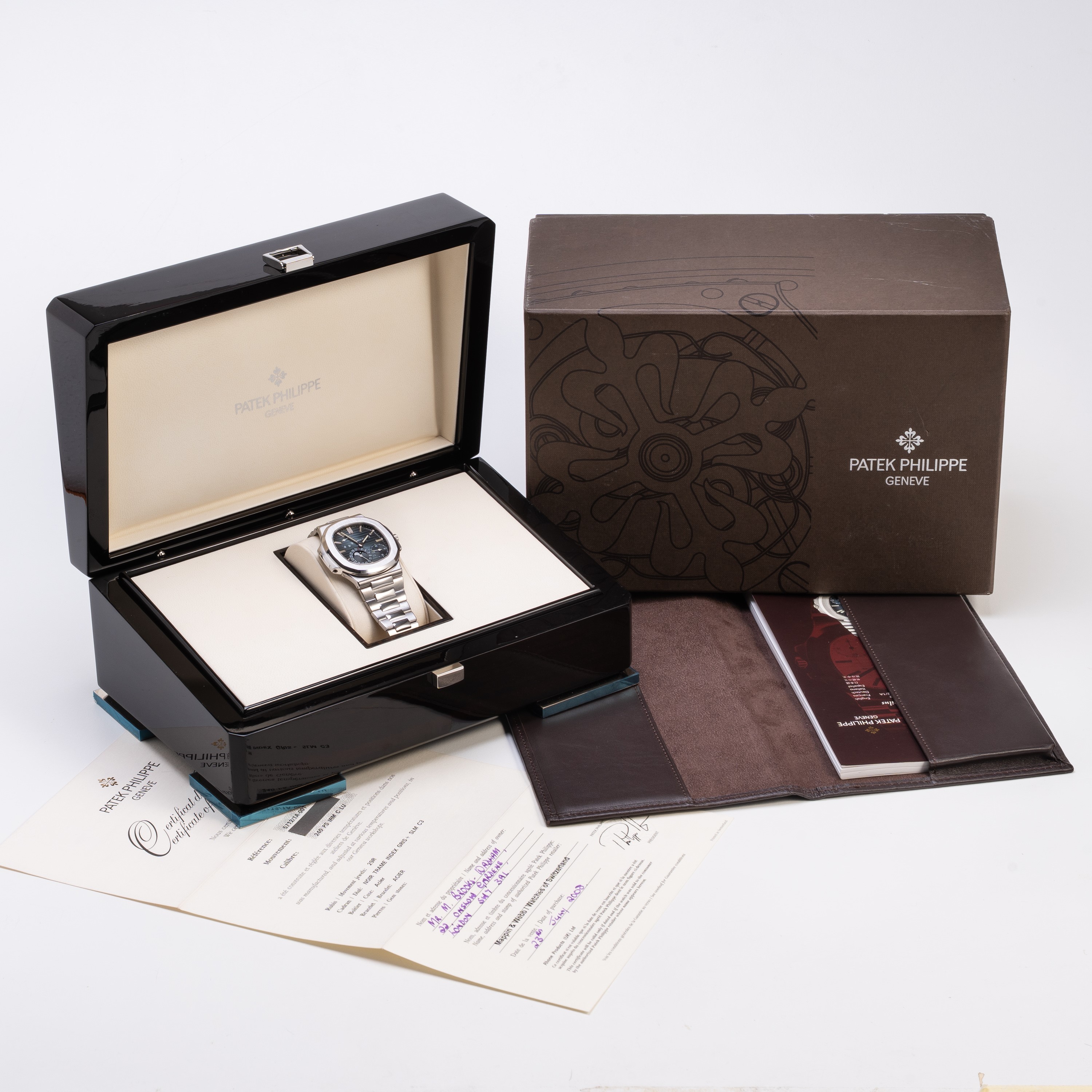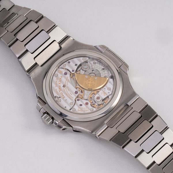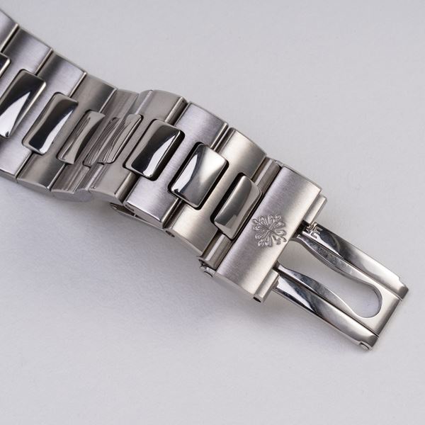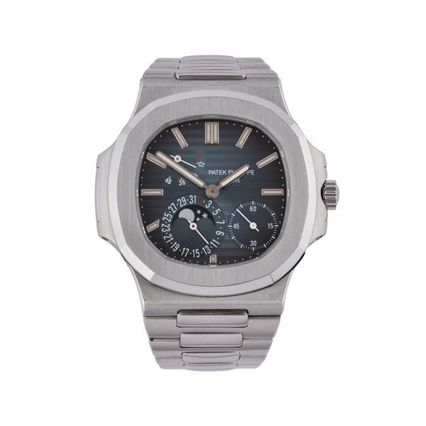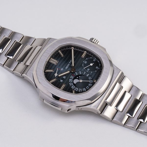 Note: Orologio a carica automatica con fasi luna, datario e fasi luna con piccoli secondi. Quadrante blu, indici e sfere a bastone con materiale luminescente argentate. Riserva di carica a ore undici, fasi luna e datario ad ore sette e piccoli secondi ad ore quattro. Bracciale in acciaio. Vetro minerale piatto. Fondello a vista.