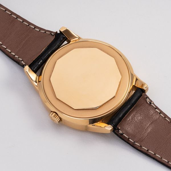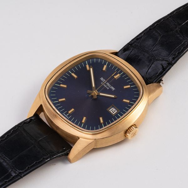 Note: Orologio solo tempo al quarzo in oro giallo 18kt. Quadrante virato al viola, datario ad ore tre. Indici e sfere a bastone in oro giallo 18kt con materiale luminescente. Cinturino in pelle, fibbia in oro giallo 18kt Patek Philippe. Vetro minerale piatto. Fondello a vite in oro giallo 18kt.