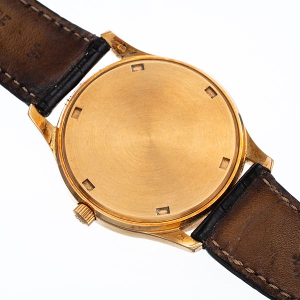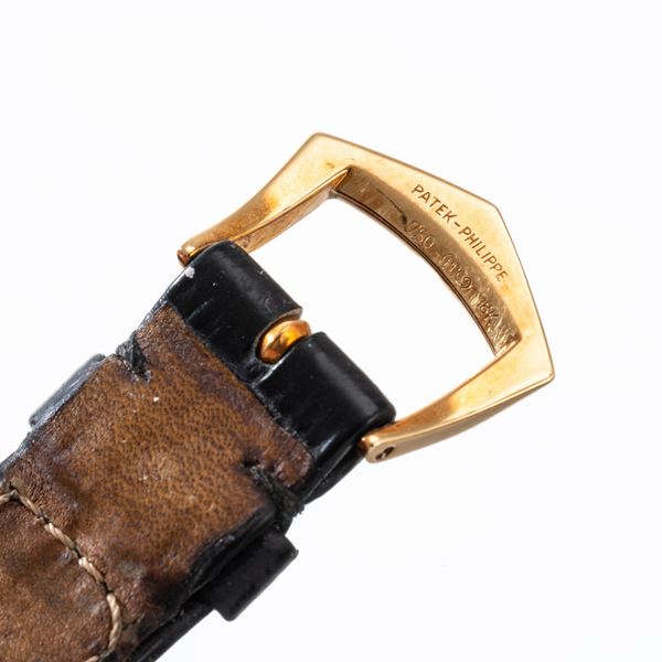Note: Orologio solo tempo a carica automatica con quadrante argenté sigma e datario ad ore tre. Sfere dauphine in oro giallo 18kt, indici a bastone in oro giallo 18kt. Secondi centrali. Cinturino in pelle Patek Philippe, fibbia in oro giallo 18kt Patek Philippe. Vetro minerale bombato, fondello a vite in oro giallo 18kt.