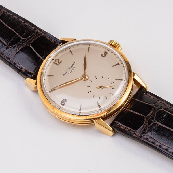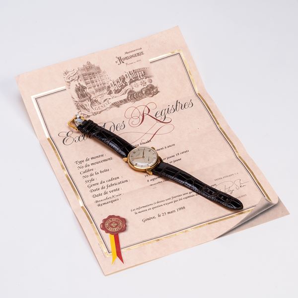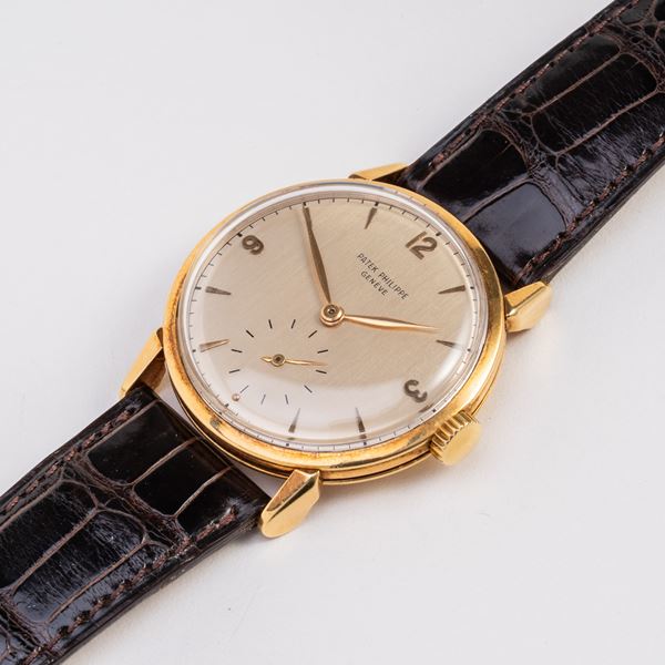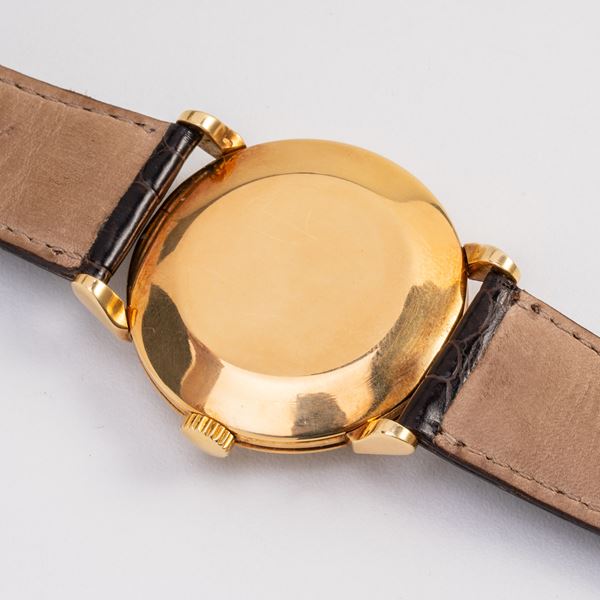 Note: Orologio solo tempo a carica manuale in oro giallo 18kt. Quadrante argenté, piccoli secondi ad ore sei. Indici arabi ad ore tre, nove e dodici e sfere a foglia dorati. Cinturino in pelle. Vetro plexiglass bombato. Fondello a pressione in oro giallo 18kt.