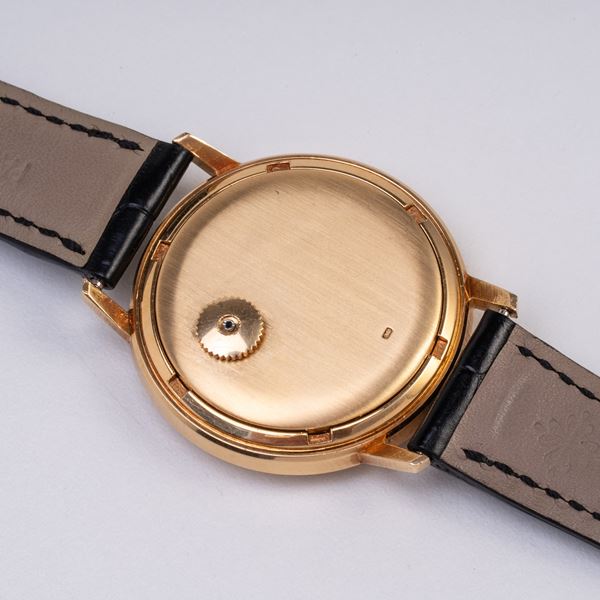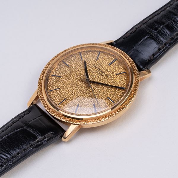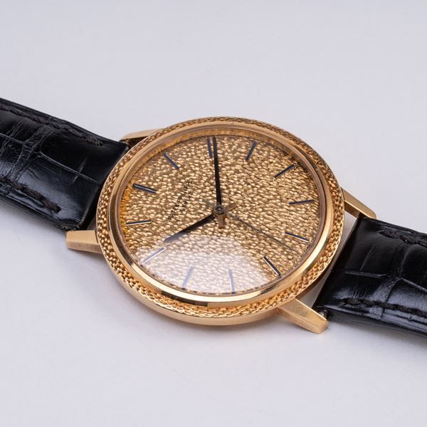 Note: Orologio solo tempo a carica automatica in oro giallo 18kt con cassa e quadrante lavorati. Quadrante oro, sfere a bastone nere, indici a bastone con lapislazzuli. Cinturino e fibbia in oro giallo 18kt Patek Philippe. Vetro minerale bombato. Fondello a vite con corona in oro giallo 18kt.