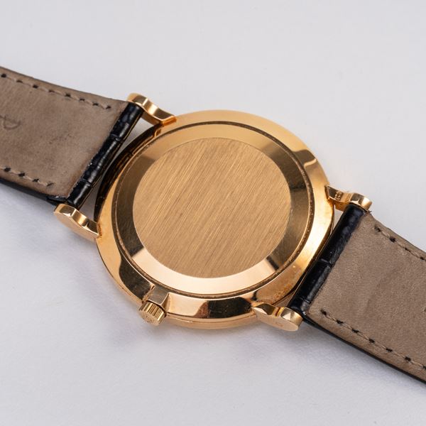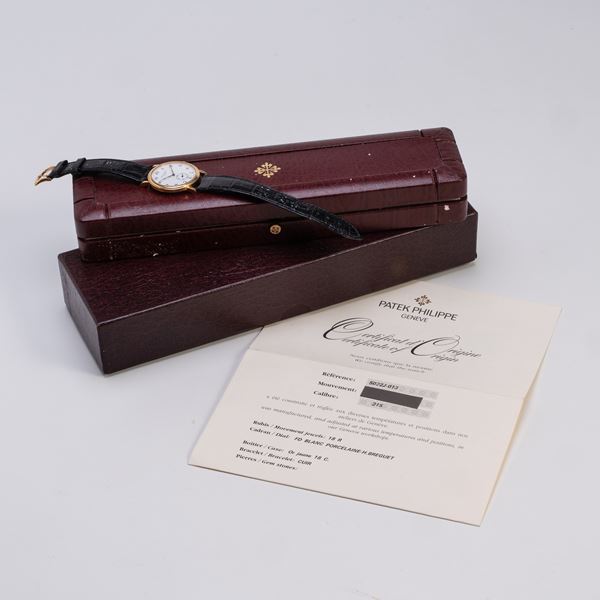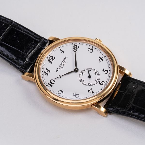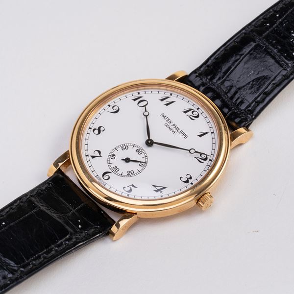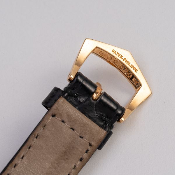Note: Orologio solo tempo a carica automatica in oro giallo 18kt con cassa a scalino. Quadrante in porcellana con indici e sfere breguet neri, piccoli secondi ad ore sei. Cinturino in pelle e fibbia in oro giallo 18kt Patek Philippe. Vetro minerale curvo. Fondello a pressine in oro giallo 18kt.