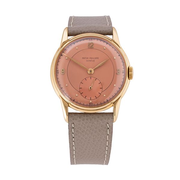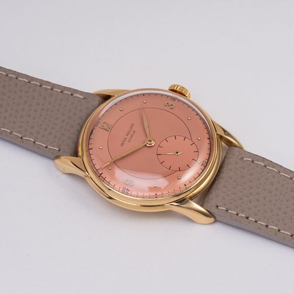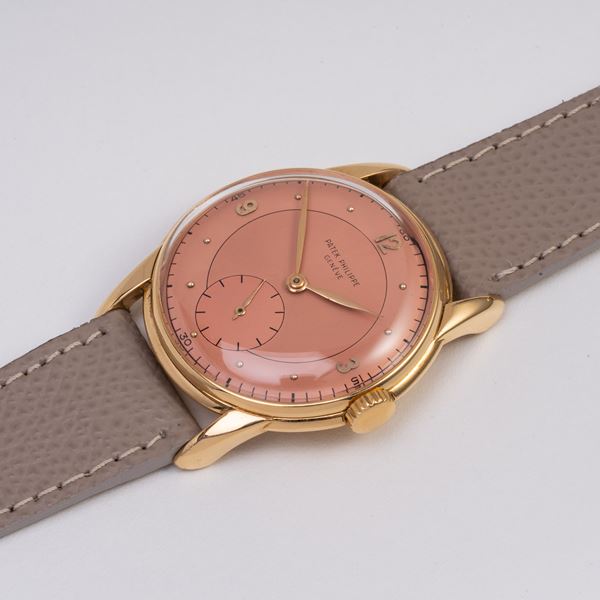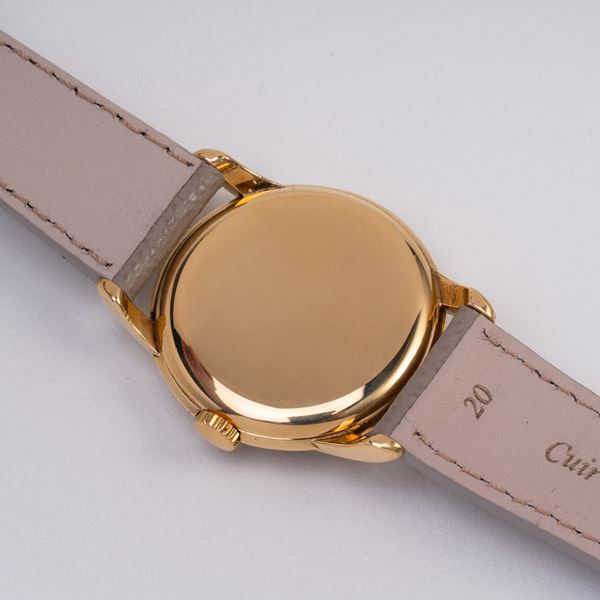 Note: Orologio solo tempo a carica manuale in oro giallo 18kt. Quadrante salmone. Indici arabi ad ore tre, nove e dodici. Sfere a foglia in oro giallo 18kt. Piccoli secondi ad ore sei. Vetro plexiglass bombato. Fondello a pressione in oro giallo 18kt.