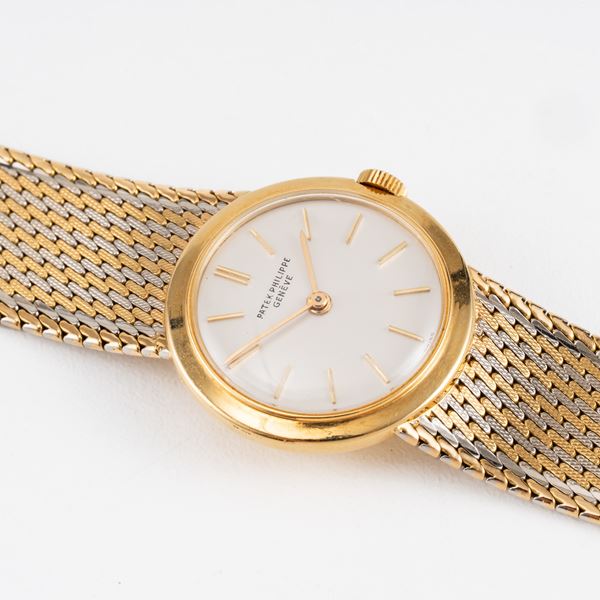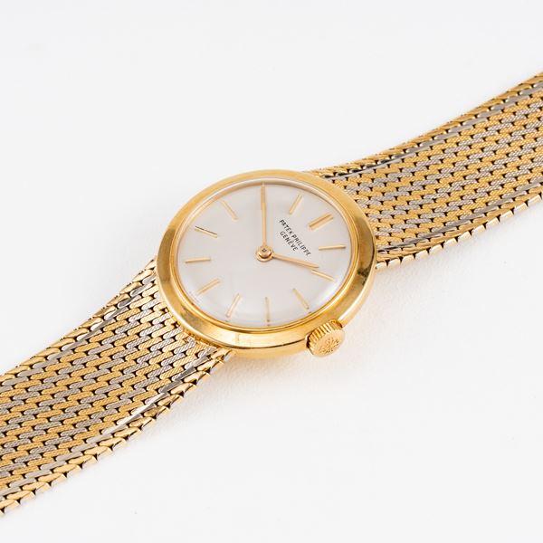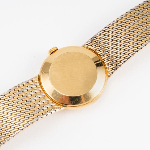 Note: Orologio solo tempo a carica manuale in oro giallo 18kt. Quadrante argenté, indici e sfere a bastone dorati. Bracciale in oro giallo e oro bianco 18k Gay Freres. Vetro minerale bombato. Fondello a pressione in oro giallo 18kt