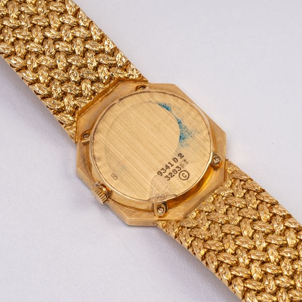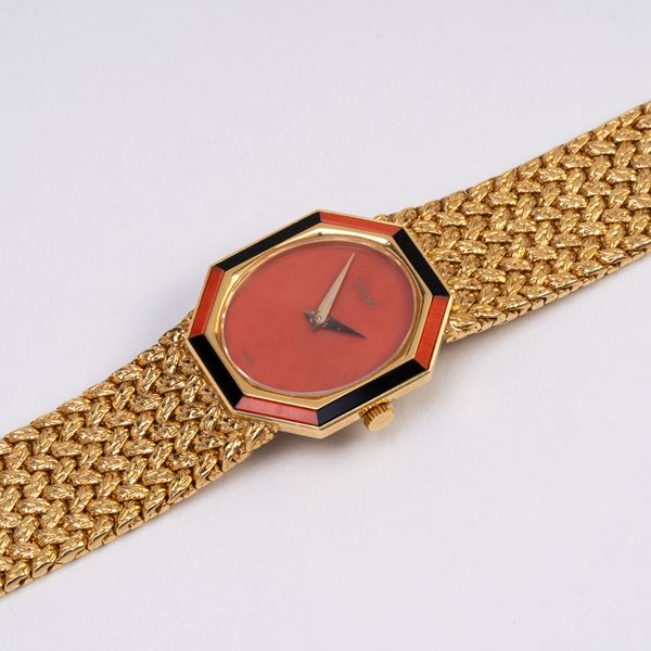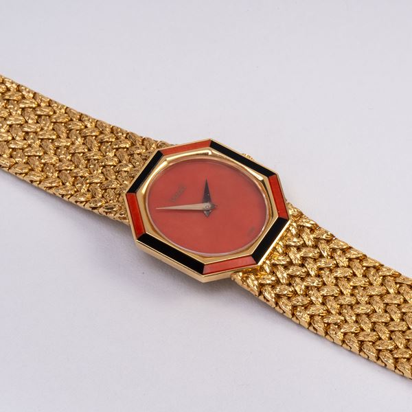 Note: Orologio da polso a carica manuale in oro giallo 18kt con bracciale integrato in oro giallo 18kt lavorato. Quadrante in corallo, ghiera smaltata arancione e nera. Sfere dauphine in oro giallo 18kt. Vetro minerale piatto. Fondello in oro giallo 18kt.