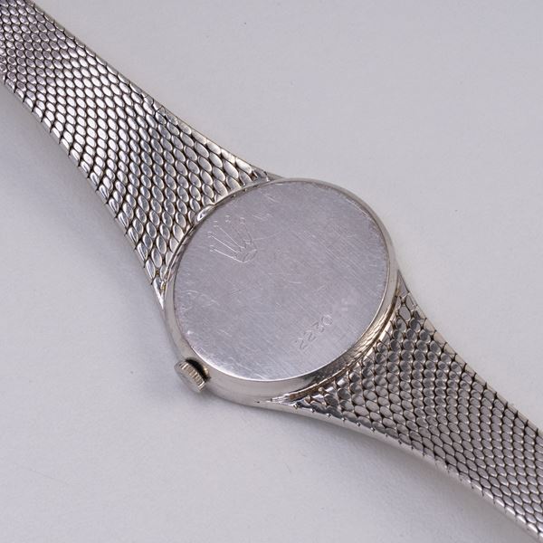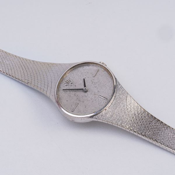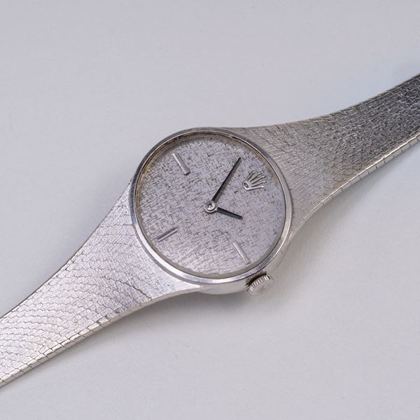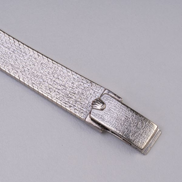 Note: Orologio solo tempo a carica manuale in oro bianco 18kt con bracciale integrato in oro bianco 18kt. Quadrante grigio, indici a bastone, sfere a bastone nere. Vetro minerale piatto. Fondello a pressione in oro bianco 18kt.