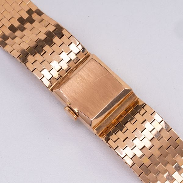 Note: Orologio solo tempo a carica manuale con bracciale integrato in oro rosa 18kt con chiusura a fibbia. Quadrante fumé, sfere dauphine e indici misti dorati. Vetro bombato minerale. Fondello a pressione in oro rosa 18kt.