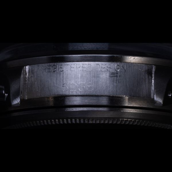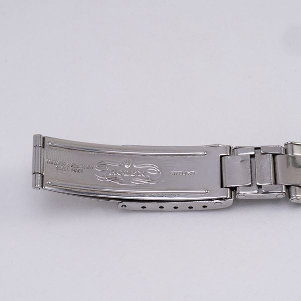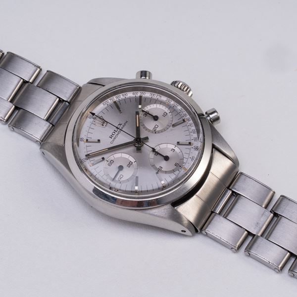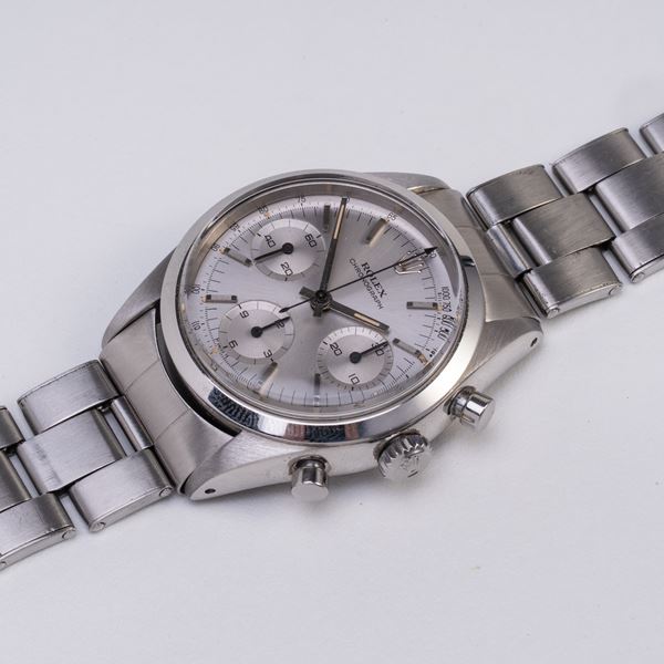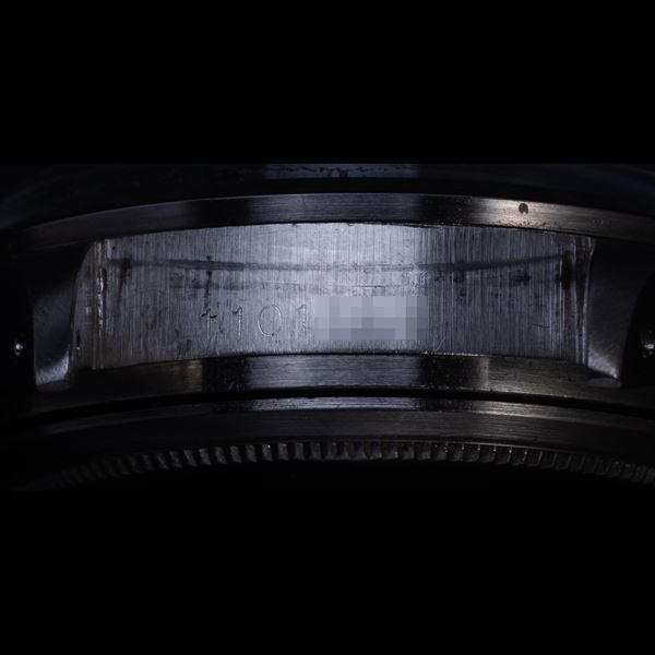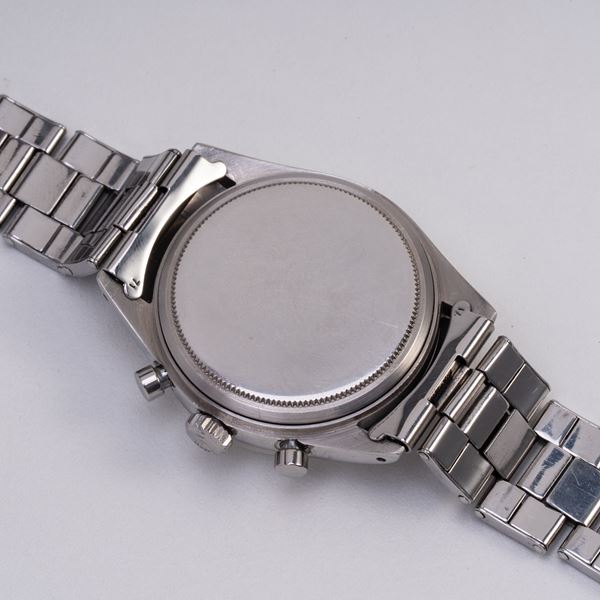 Note: Cronografo a carica manuale in acciaio. Quadrante grigio, indici e sfere a bastone con materiale luminescente. Scala tachimetrica con base mille. Sfere dei contatori a bastone nere. Bracciale rivetti in acciaio Rolex. Vetro plexiglass bombato. Fondello in acciaio a vite.