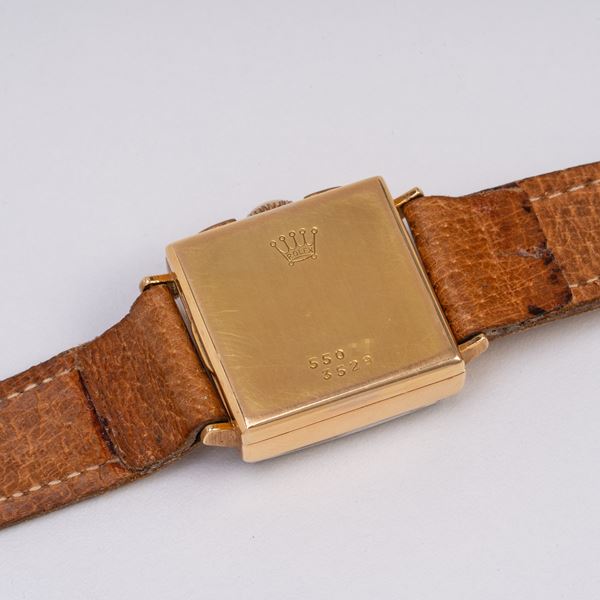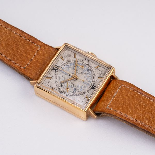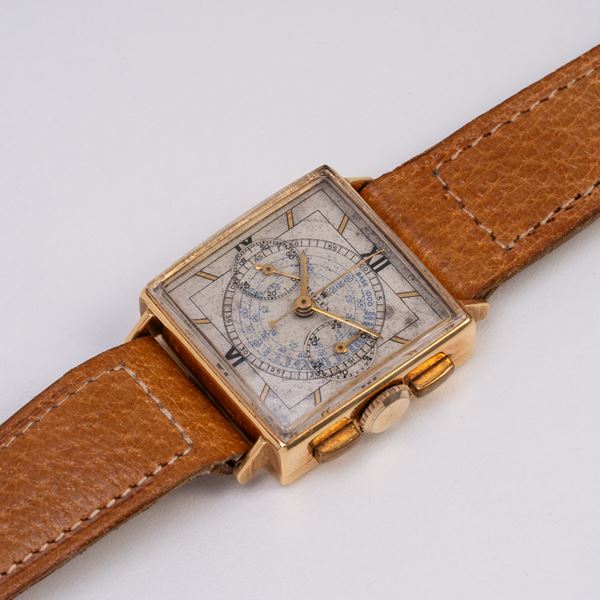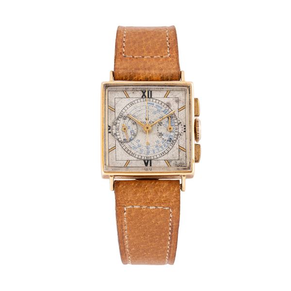 Note: Orologio solo tempo a carica manuale in oro giallo 18kt. Quadrante bianco, scala telemetrica con scala 1000 azzurra, indici romani ad ore tre, sei, nove, dodici neri e indici a bastone specchiati. Sfere a bastone dorate. Cinturino in pelle. Vetro plexiglass bombato. Fondello a scatto in oro giallo 18kt.