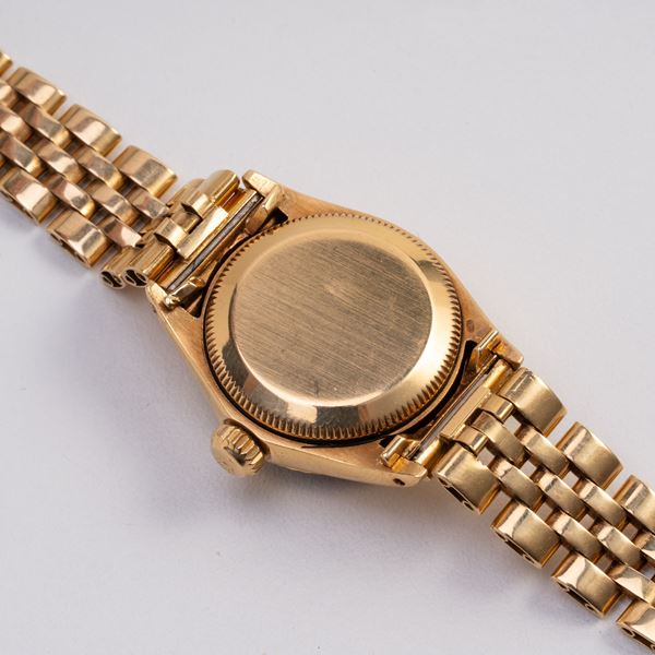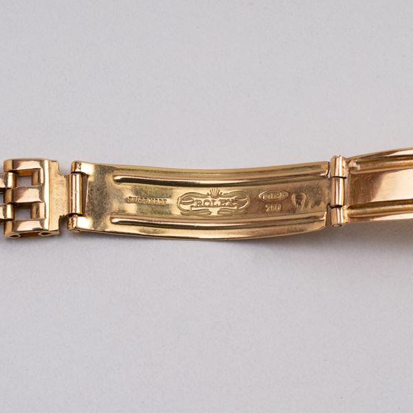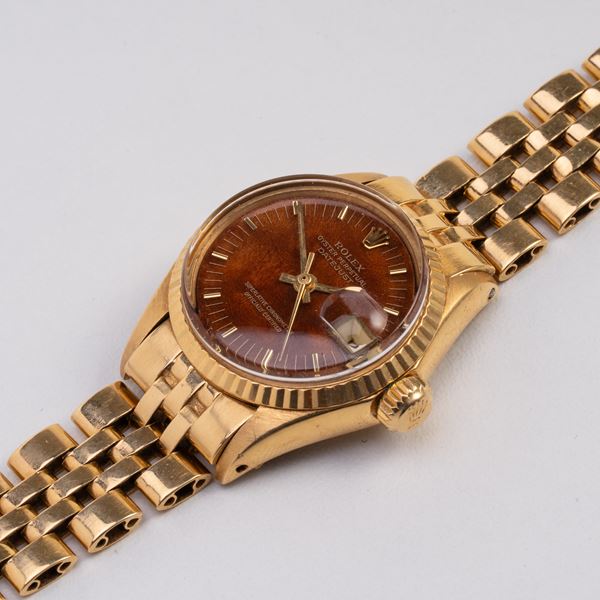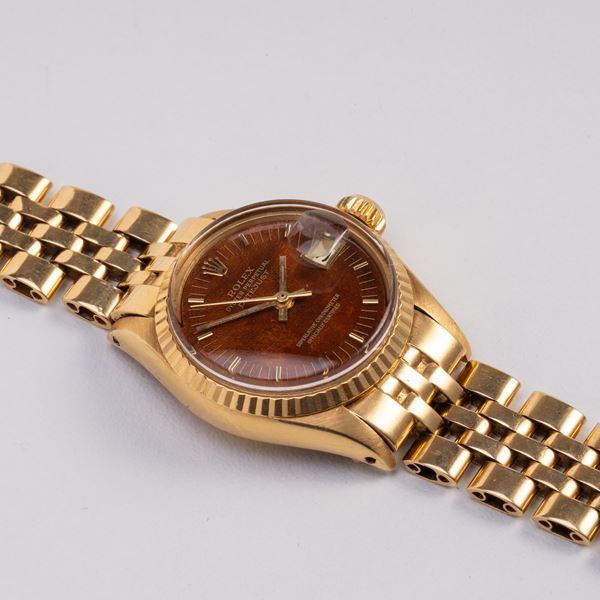 Note: Orologio solo tempo a carica automatica in oro giallo 18kt con bracciale jubilee in oro giallo 18kt. Quadrante in radica, indici e sfere con materiale luminescente dorati. Datario ad ore tre. Vetro plexiglass bombato. Fondello a vite in oro giallo 18kt.