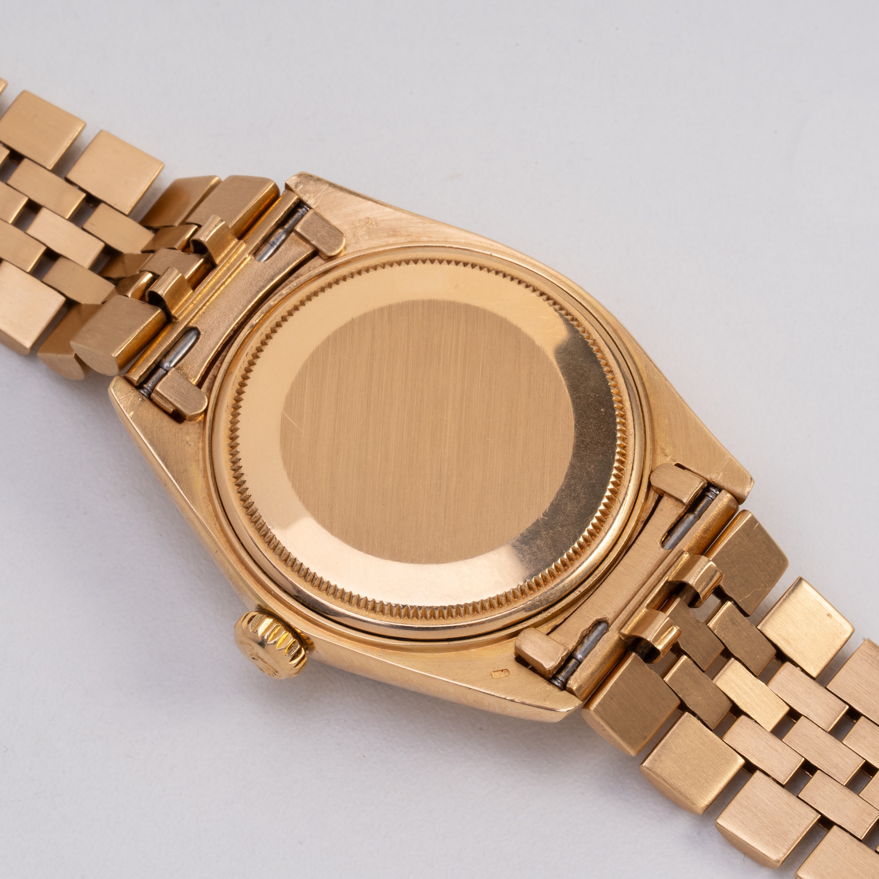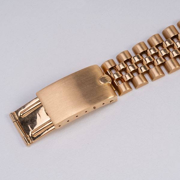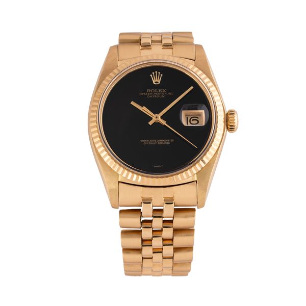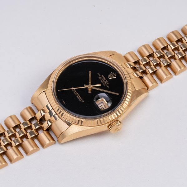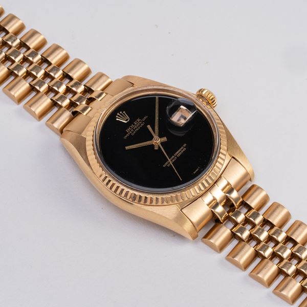 Note: Orologio solo tempo a carica automatica in oro giallo 18kt. Bracciale jubilee in oro giallo 18kt. Quadrante in onice, datario ad ore tre. Sfere a bastone dorate. Vetro plexiglass bombato. Fondello a vite in oro giallo 18kt