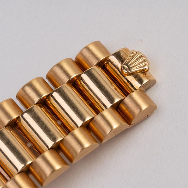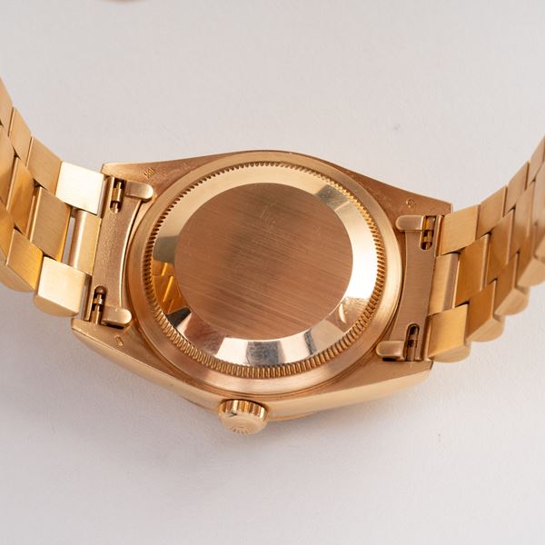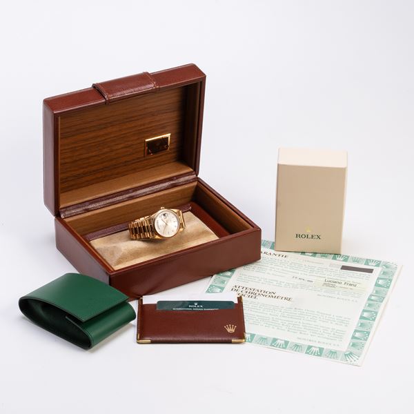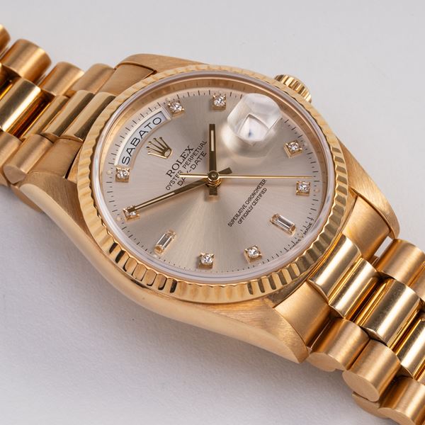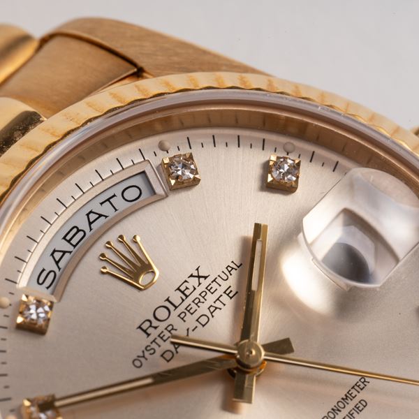 Note: Orologio Day Date in oro giallo 18kt, bracciale 'President' in oro giallo 18kt. Quadrante argentè con indici diamanti factory, sfere a bastone con materiale luminescente dorate, datario ad ore tre, finestra del giorno ad ore dodici. Calendario italiano. Vetro minerale piatto. Fondello a vite in oro giallo 18kt.