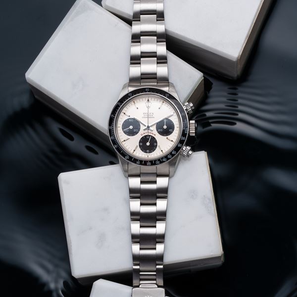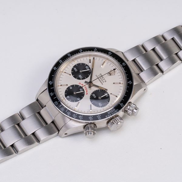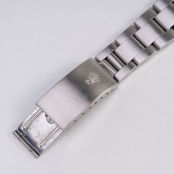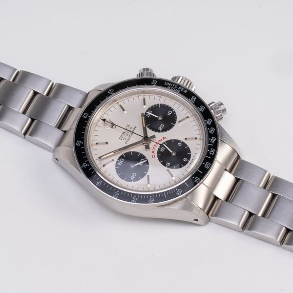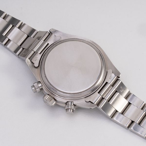 Note: Cronografo a carica manuale in acciaio con ghiera in bachelite. Quadrante argenté 'Big Red', contatori neri, indici e sfere a bastone argentati con materiale luminescente. Bracciale Oyster in acciaio. Vetro plexglass bombato. Fondello a vite in acciaio.