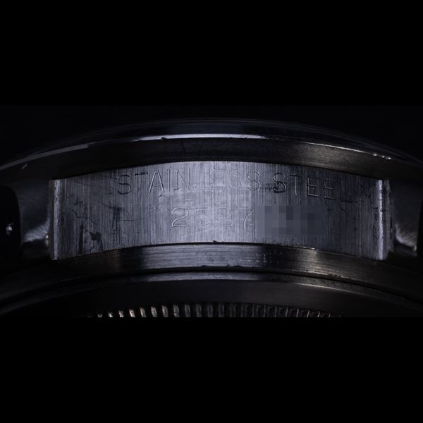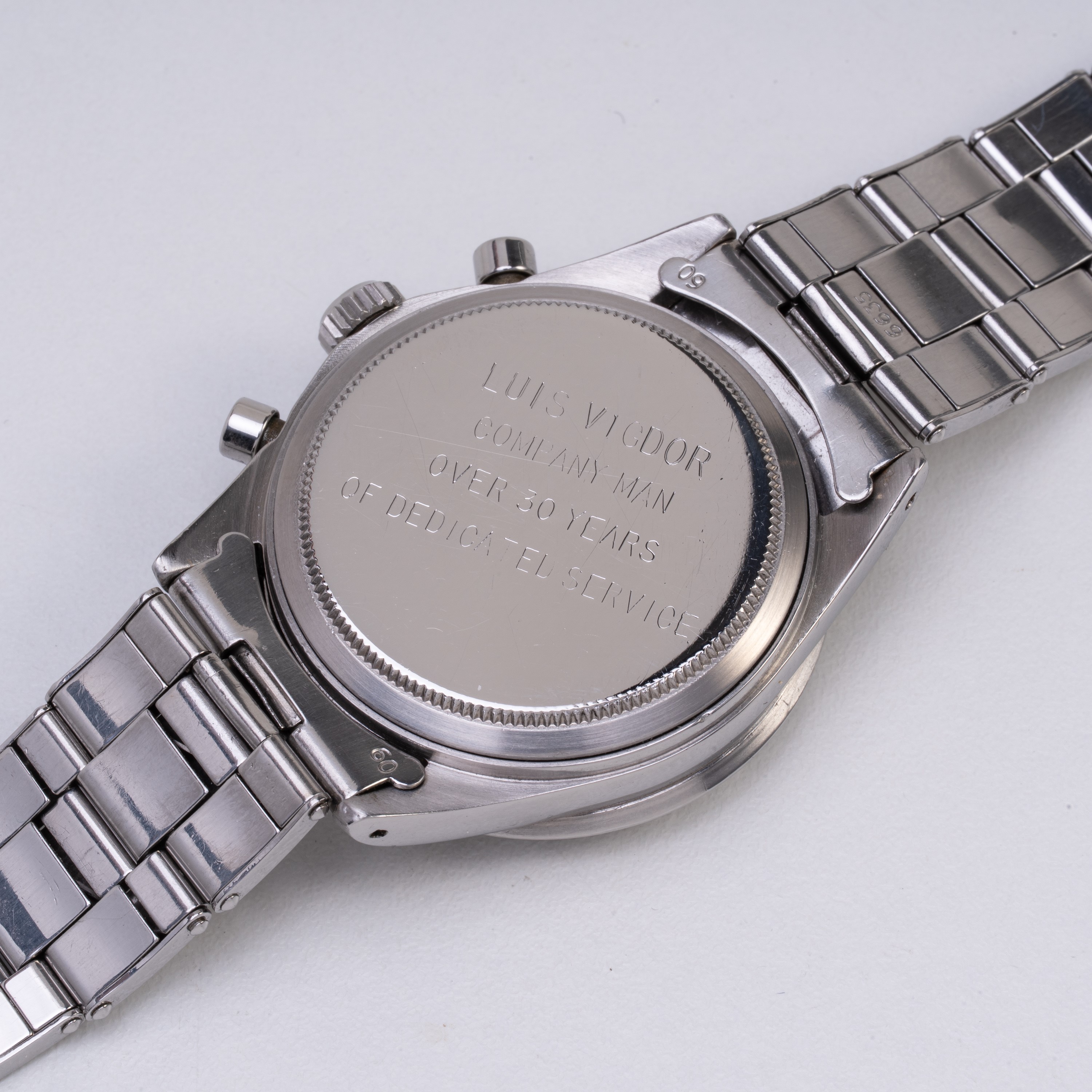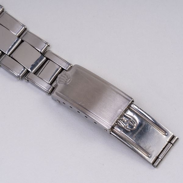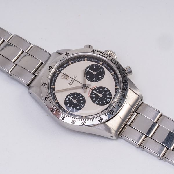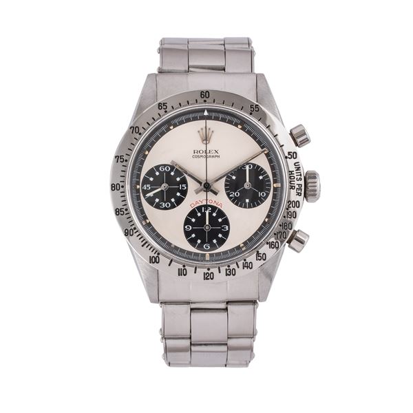 Note: Cronografo in acciaio a carica manuale in acciaio. Quadrante 'Paul Newman' bianco con contatori cronografici neri. Sfere a bastone con materiale luminescente. Ghiera tachimetrica con scala 200. Bracciale in acciaio a rivetti elastico Rolex. Vetro plexiglass bombato. Fondello a vite in acciaio.