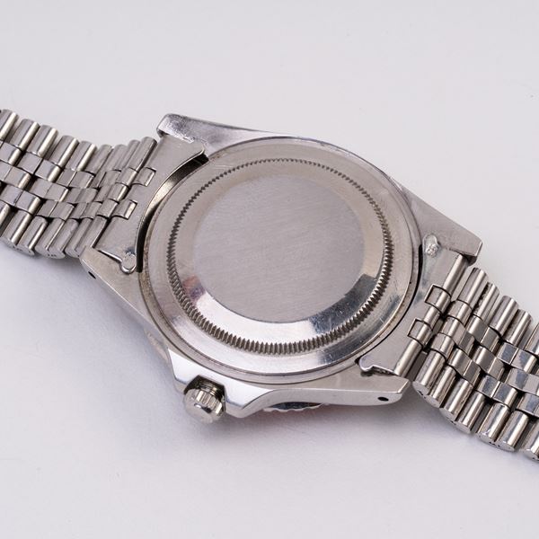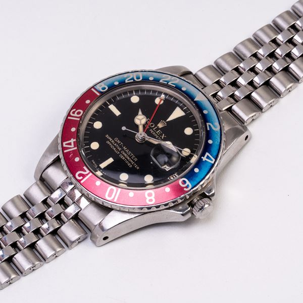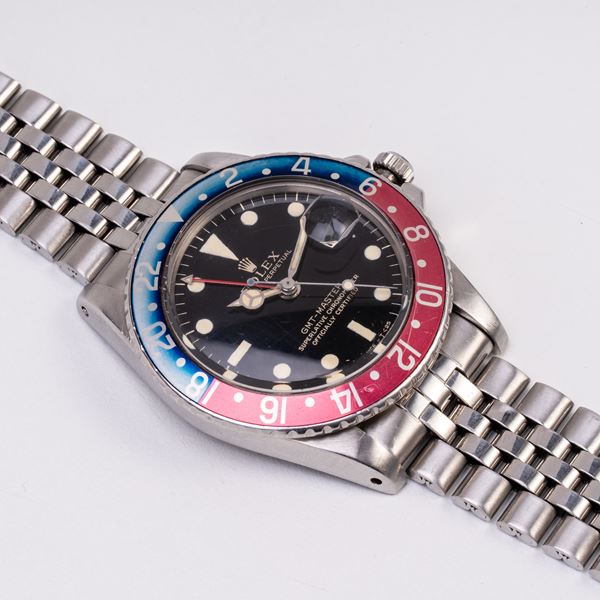 Note: Orologio GMT in acciaio, quadrante nero 'Gilt', datario ad ore tre. Ghiera bidirezionale bicolore rossa e blu. Sfere mercedes con materiale luminescente. Bracciale 'jubilee' in acciaio. Vetro plexiglass bombato. Fondello a vite in acciaio