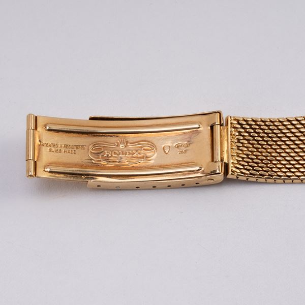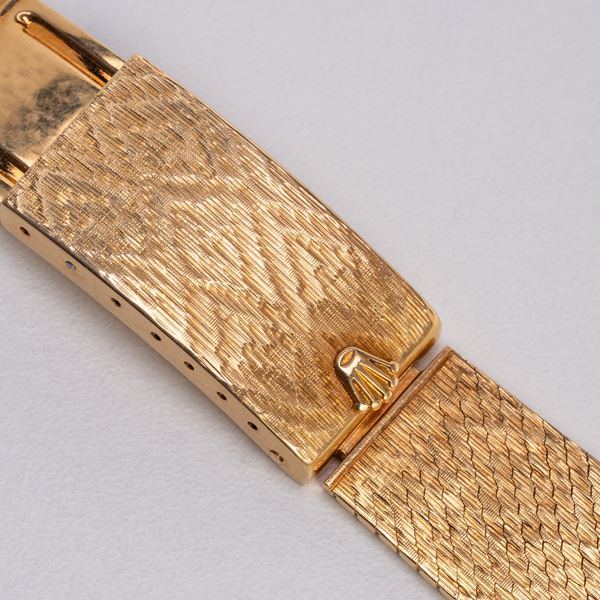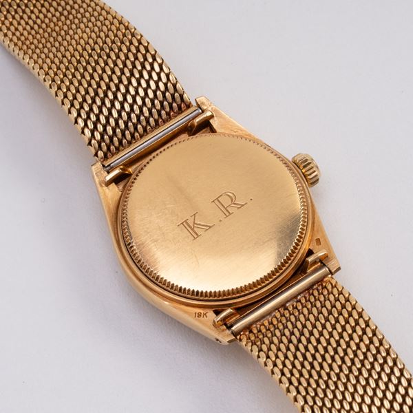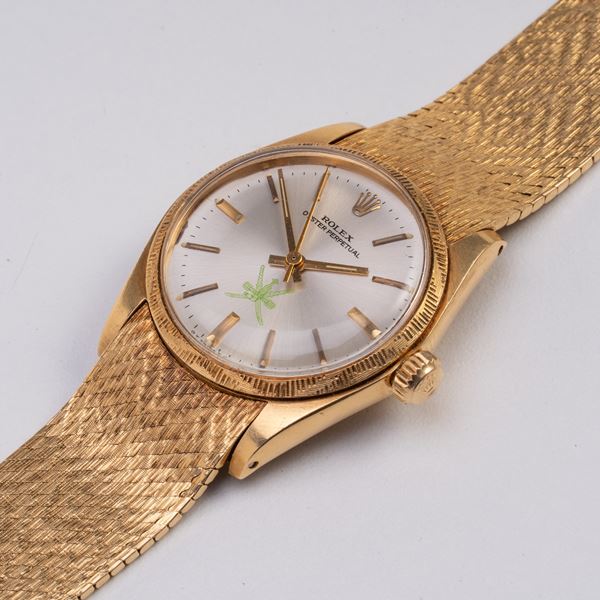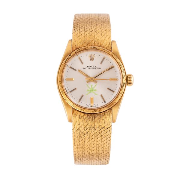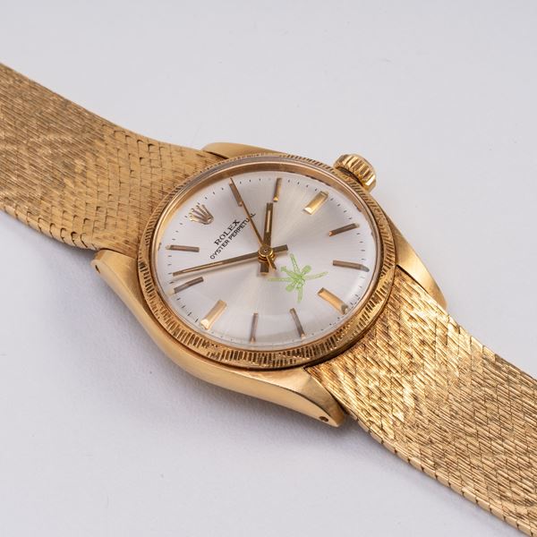 Note: Orologio solo tempo a carica automatica in oro giallo 18kt, bracciale in oro giallo 18kt lavorato e ghiera lavorata. Quadrante argenté sigma, indici e sfere a bastone in oro giallo 18kt con materiale luminescente. Spade Khanjar verdi ad ore sei. Vetro plexiglass bombato. Fondello a vite in oro giallo 18kt con incise iniziali 'K.R.'.