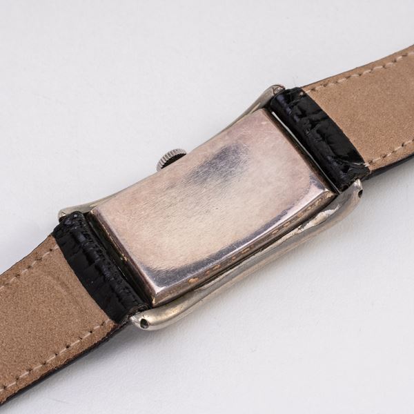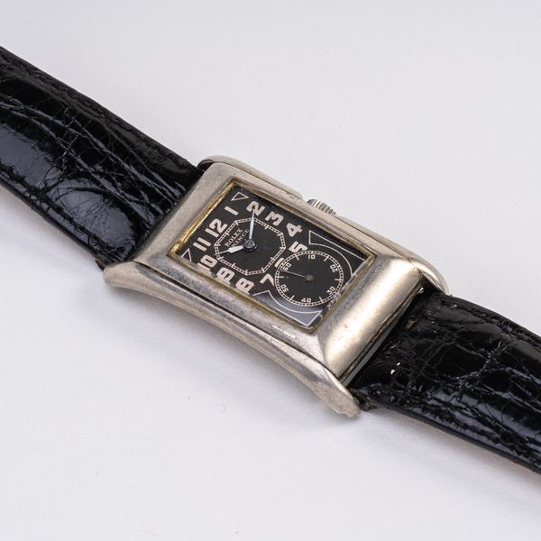 Note: Orologio solo tempo a carica manuale in argento. Quadrante nero, indici arabi bianchi, sfere brunite blu bianche. Piccoli secondi ad ore sei. Cinturino in pelle, fibbia Rolex. Vetro minerale bombato. Fondello a pressione in argento.