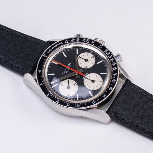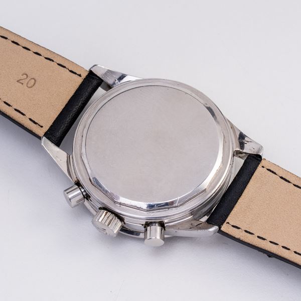 Note: Cronografo a carica manuale in acciaio con contatori bianchi. Indici a bastone bianchi con materiale luminescente, sfere a bastone in acciaio con materiale luminescente. Sfera cronografica rossa con materiale luminescente. Ghiera con scala tachimetrica nera. Vetro plexiglass bombato. Fondello in acciaio a vite.