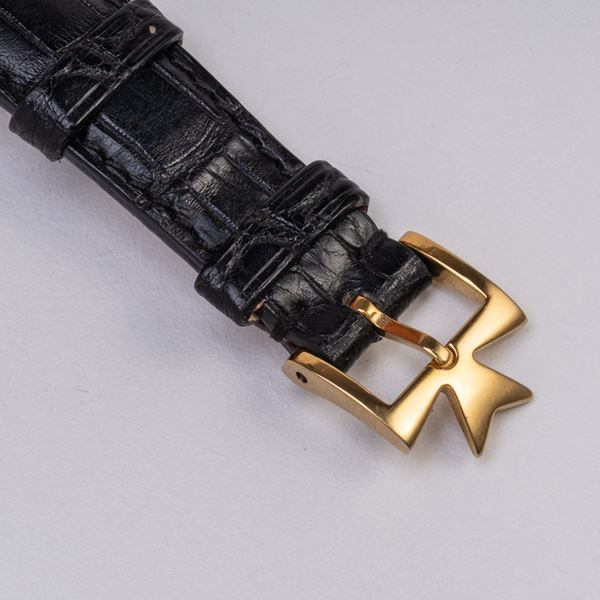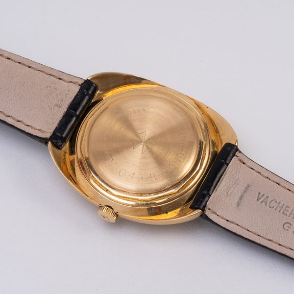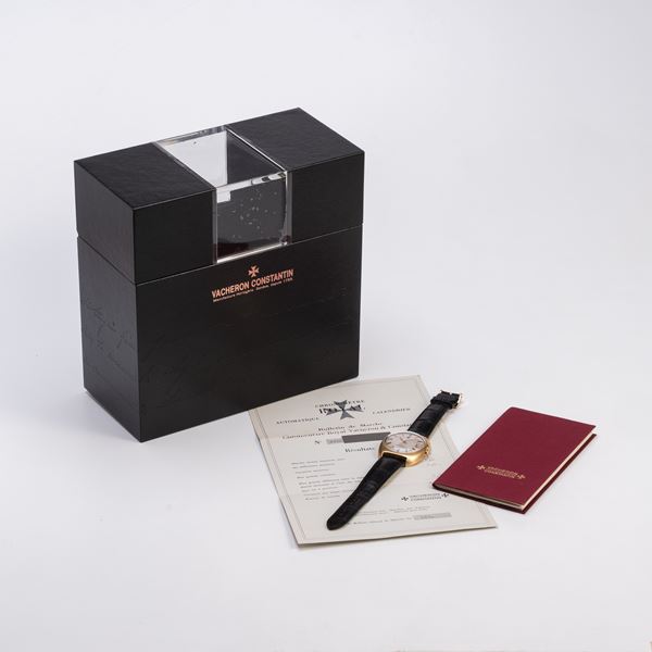 Note: Orologio solo tempo a carica automatica in oro giallo 18kt. Quadrante 'lino', logo applicato ad ore dodici con diamante taglio brillante. Indici e sfere a bastone con materiale luminescente. Datario ad ore tre. Cinturino in pelle Vacheron Constantin, fibbia dorata. Vetro plexiglass bombato. Fondello a vite in oro giallo 18kt.