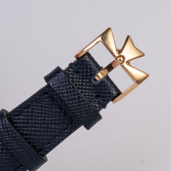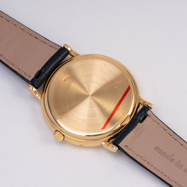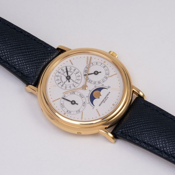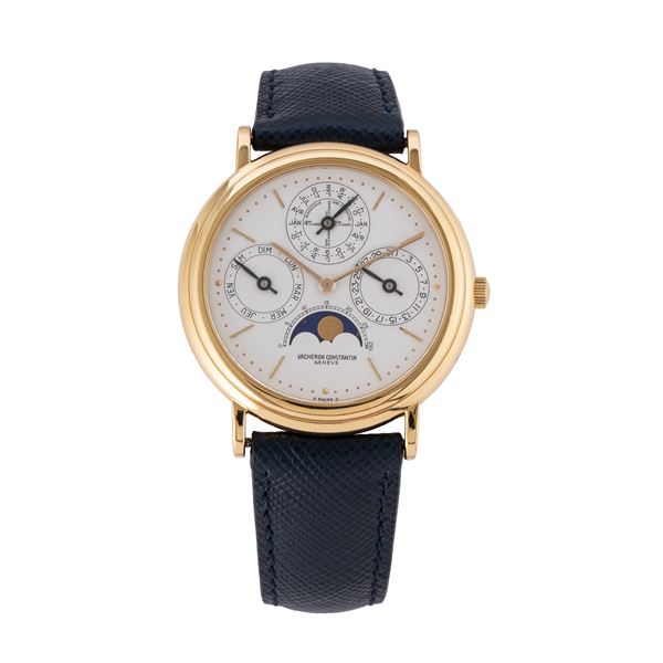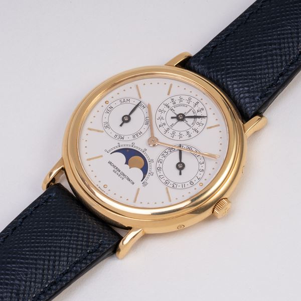 Note: Calendario perpetuo in oro giallo 18kt a carica automaica. Quadrante bianco sigma, indici e sfere a bastone in oro giallo 18kt. Fasi luna ad ore sei, contatore del giorno ad ore nove, della data ad ore tre, del mese con bisestile ad ore dodici. Cinturino in pelle, fibbia Vacheron Constantin in oro giallo 18kt. Vetro minerale piatto. Fondello a pressione in oro giallo 18kt.