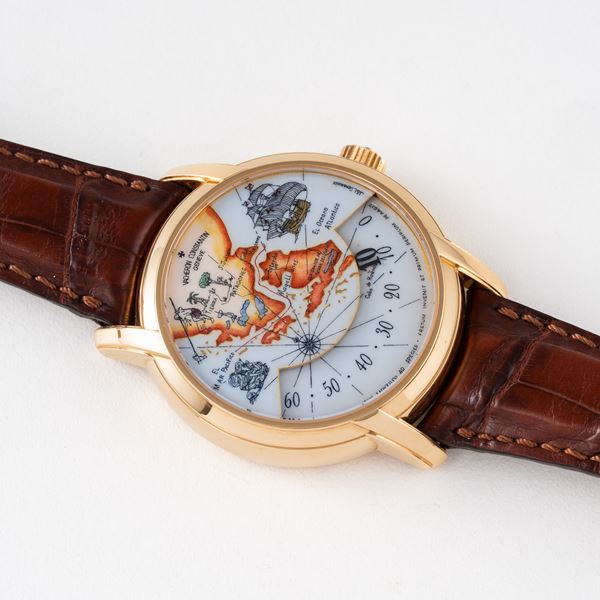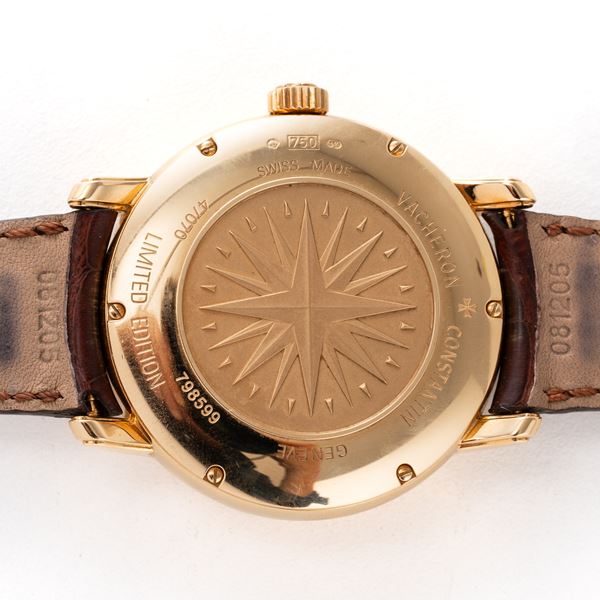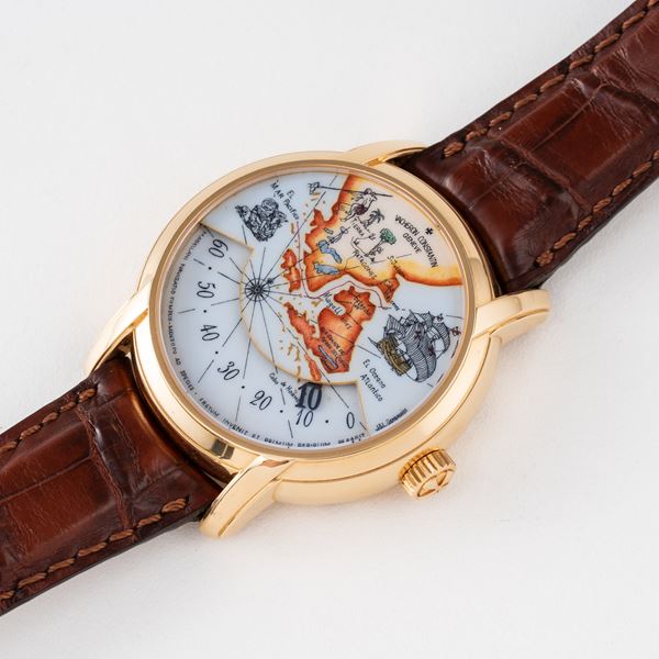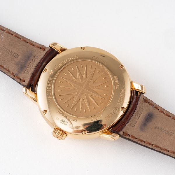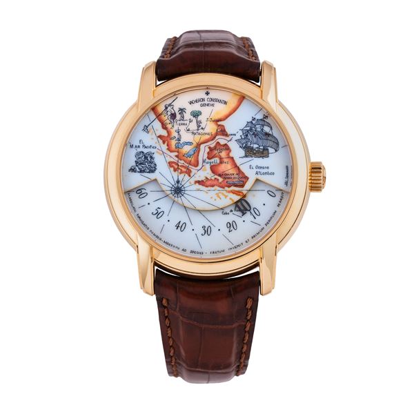 Note: Orologio retrogrado a carica automatica in oro rosa 18kt. Quadrante cloisonneé. Indici arabi blu. Cinturino in pelle e deployante in oro rosa 18kt Vacheron Constantin. Vetro minerale bombato. Fondello in oro rosa 18kt.
