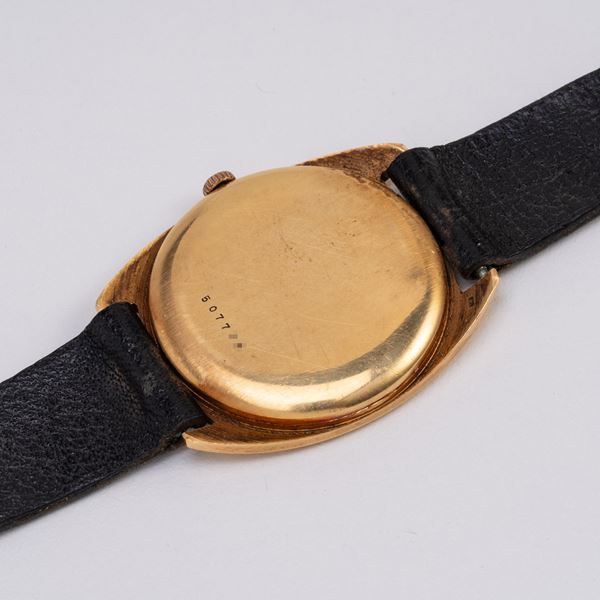 Note: Orologio solo tempo a carica manuale in oro giallo 18kt. Quadrante champagne, indici e sfere a bastone dorati . Cinturino in pelle, fibbia in oro giallo 18kt AW. Vetro minerale piatto. Fondello a pressione in oro giallo 18kt