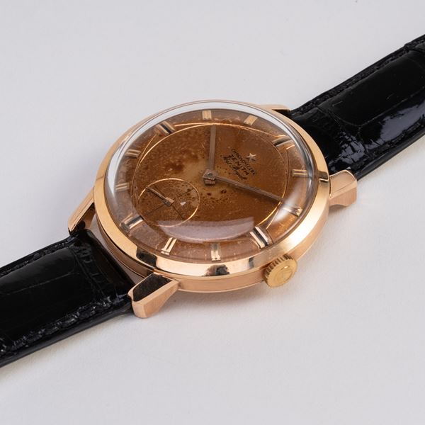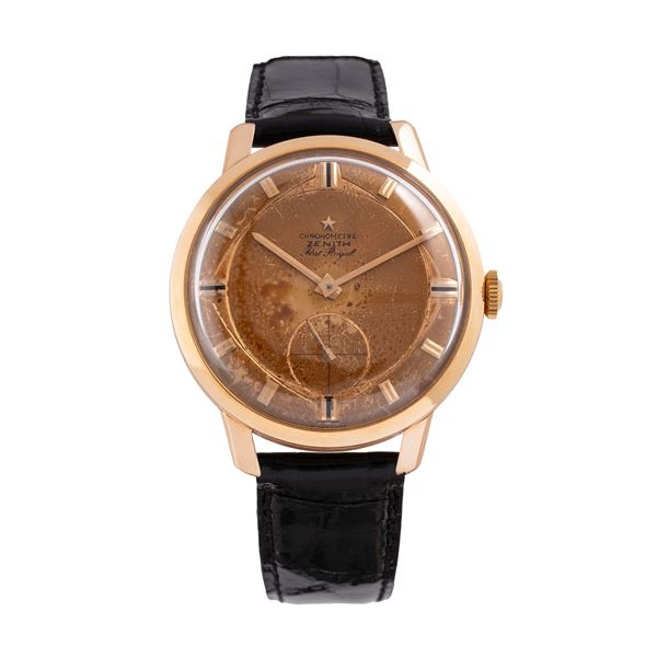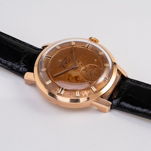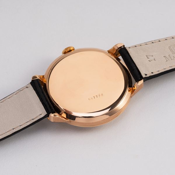 Note: Orologio solo tempo a carica manuale in oro rosa 18kt. Quadrante tropicale, indici e sfere a bastone dorati. Gli indici ad ore tre, sei, nove e dodici presentano nella parte centrale vernice nera. Il quadrante presenta una lavorazione in prossimità degli indici. Cinturino in pelle. Fibbia in oro rosa 18kt. Vetro plexiglass bombato. Fondello a pressione in oro rosa 18kt.