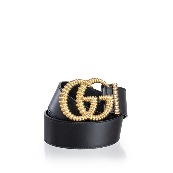 GUCCI CINTURA LARGA GG MARMONT IN PELLE NERA E FIBBIA OTTONE ANTICATO