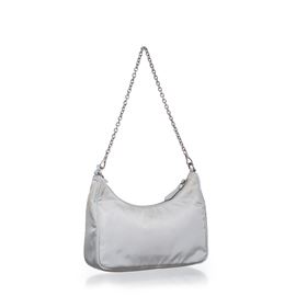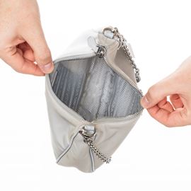 Note: Clochette portachiavi, tracolla regolabile e amovibile in nastro lunghezza 85 cm, manico in catena rimovibile, necessaire rimovibile con zip, dustbag della tracolla