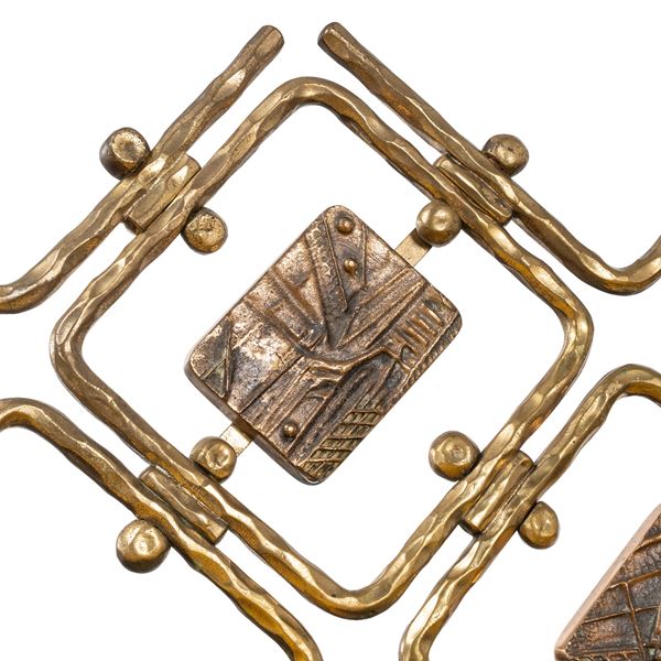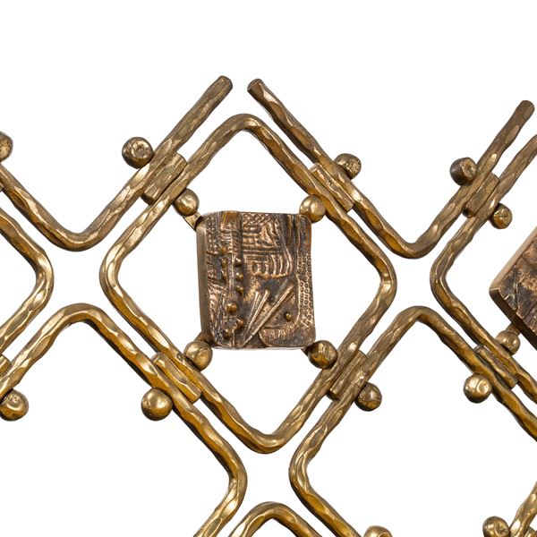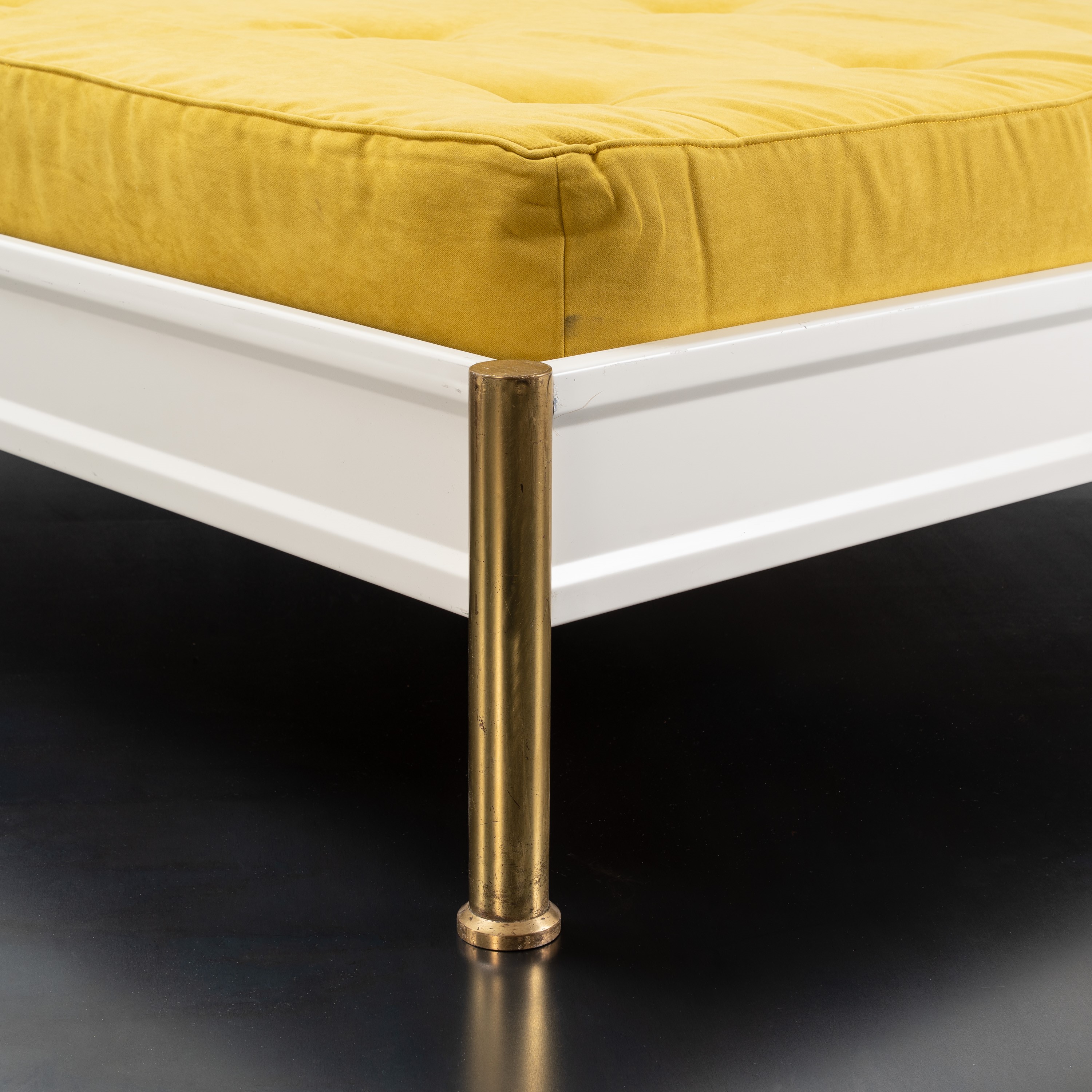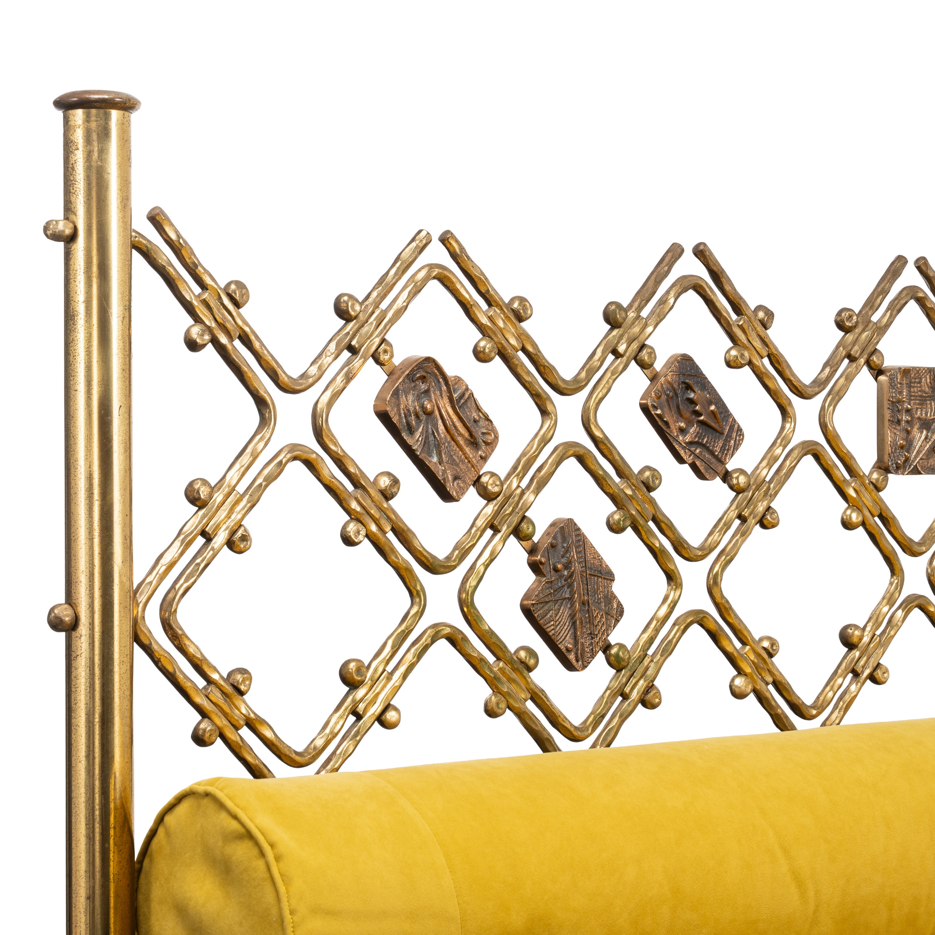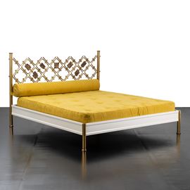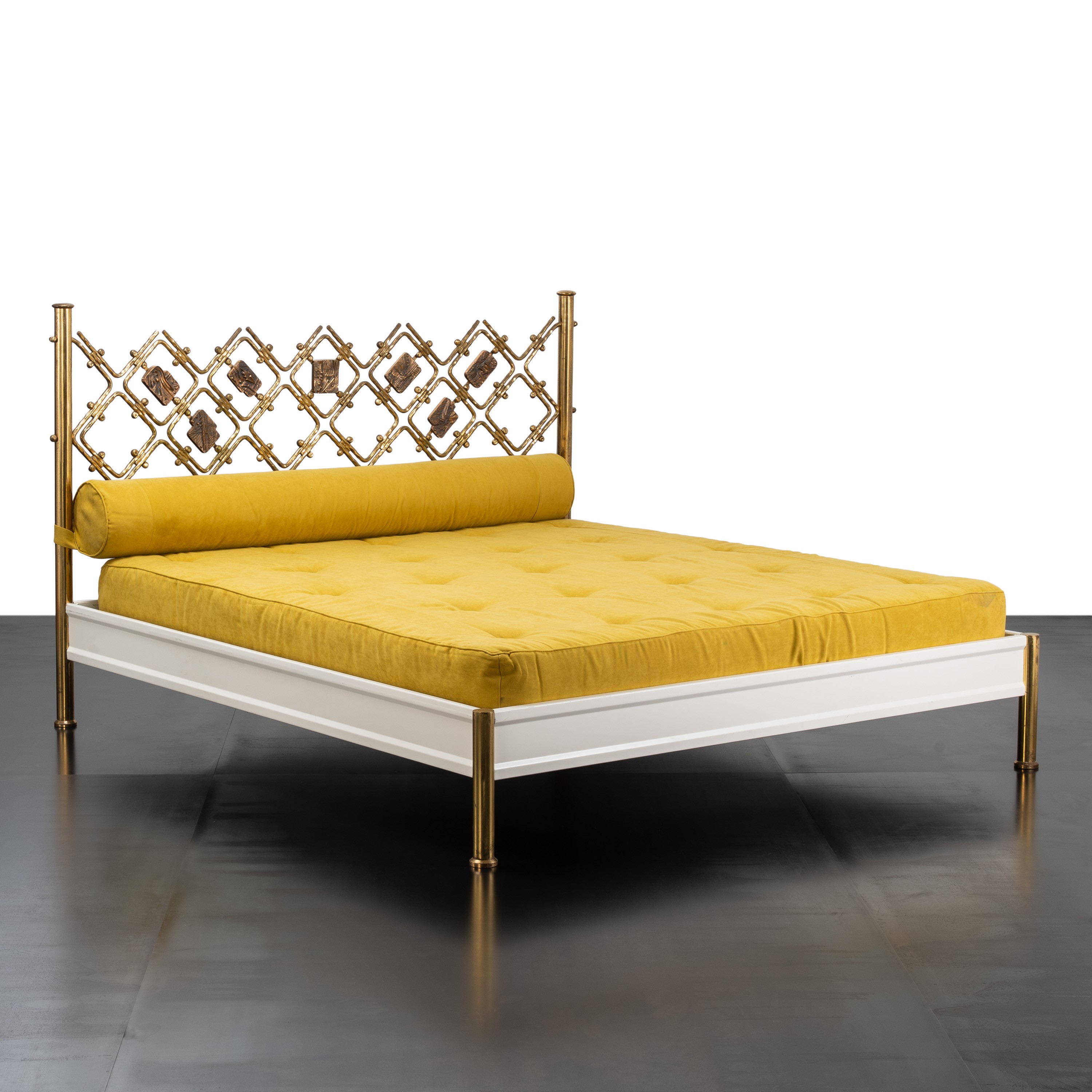 Struttura in ottone e metallo laccato bianco, testiera in ottone con piastre scultoree in bronzo, rivestimento in tessuto